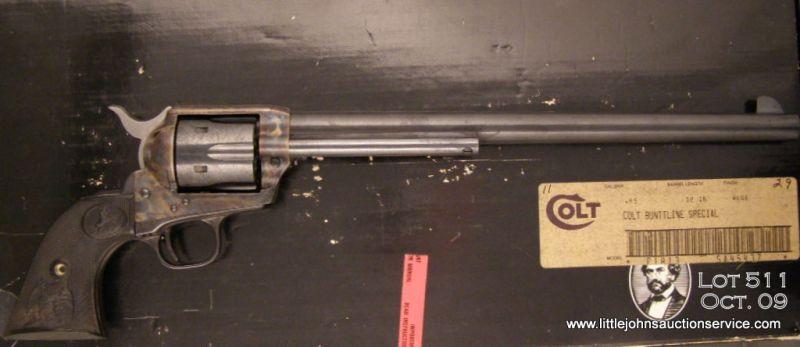 Colt Third Generation SAA Buntline Special revolver, .45 cal., 12” barrel, blue and case hardened finish, checkered eagle hard rubber grips, #SA45437. This gun is in overall excellent condition showing little handling and only a veryslight drag line on the cylinder. It is contained in its factory black cardboard box numbered to this gun. Est.: $700-$1,400.