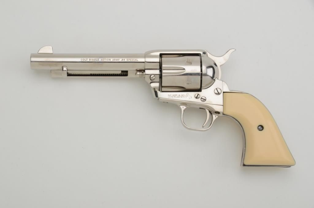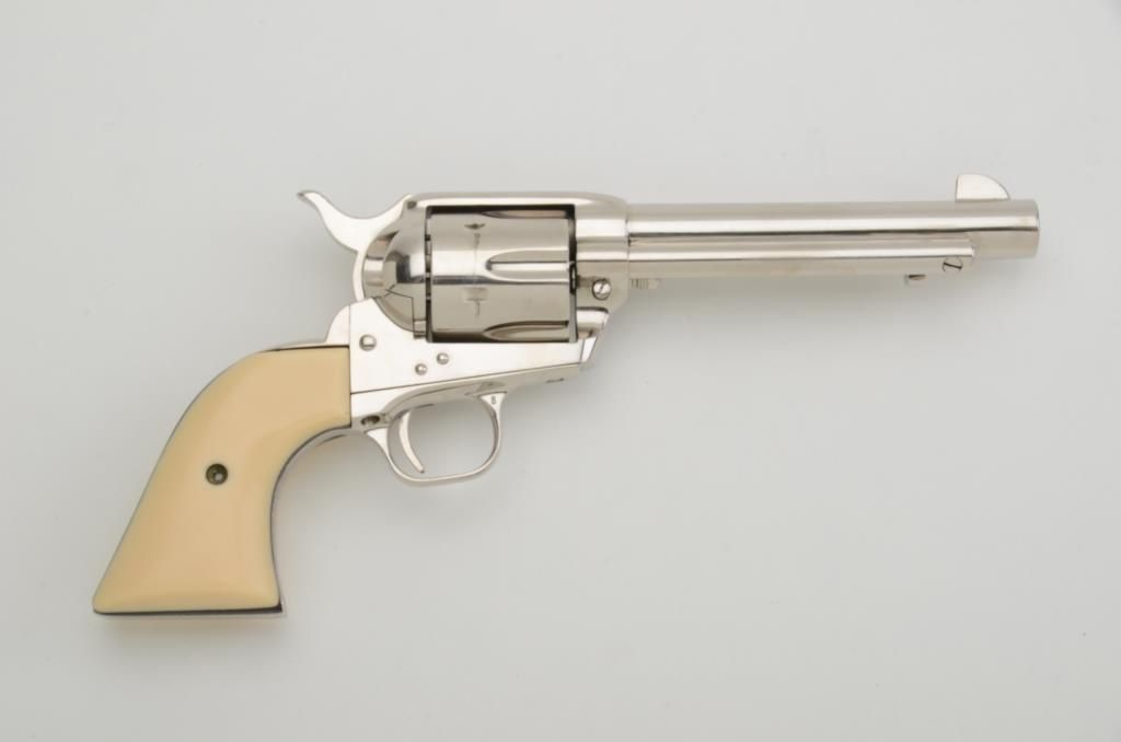 Colt Third Generation SAA revolver, .44 Special cal., 5-1/2” barrel, nickel finish, ivory-like grips, #SA28983. This gun is in overall excellent condition showing approx. 99%+ original finish, fine bore, action,markings and grips. Est.: $800-$1,400.