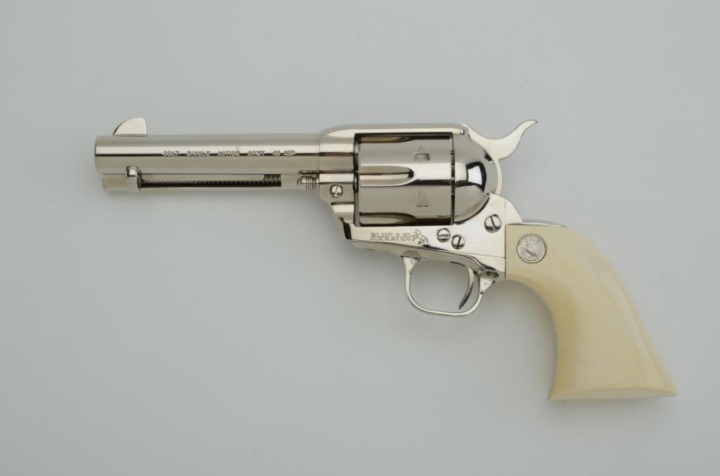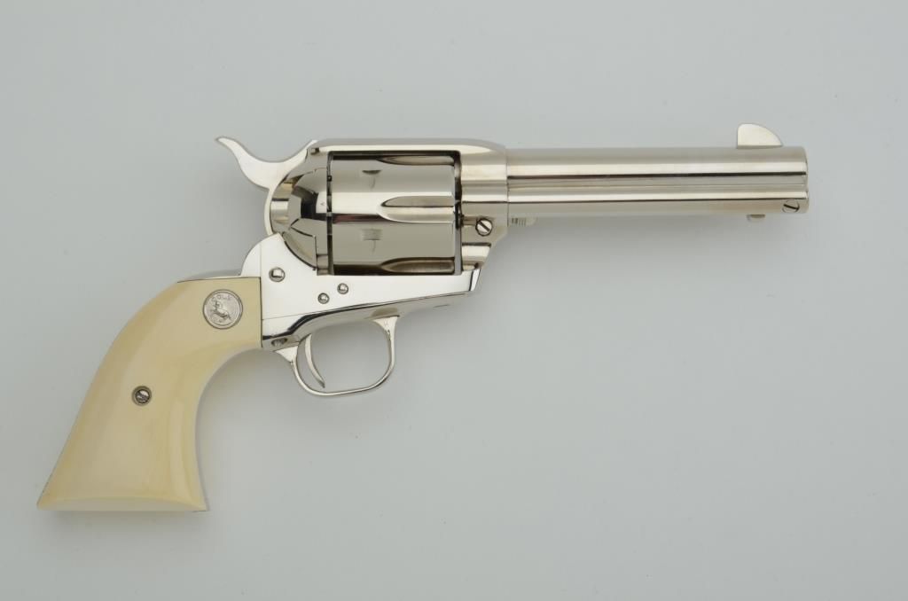 Colt Third Generation SAA revolver, .45 ACP cal., 4-3/4” barrel, nickel finish, ivory medallion grips, #SA64999. This gun is in like new condition showing little handling; a beautiful piece in unusual caliber withgreat grips! Est.: $800-$1,600.