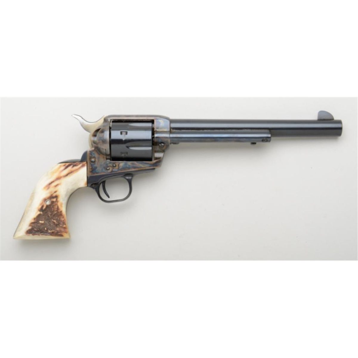 Colt Third Generation SAA revolver, .45 cal., 7-1/2” barrel, blue and case hardened finish, after-market stag grips, #SA09451. This gun is in like new condition showing little handling; accompanied by a Colt woodgrained factory cardboard box with insert; box shows some damage. Est.: $700-$1,400.