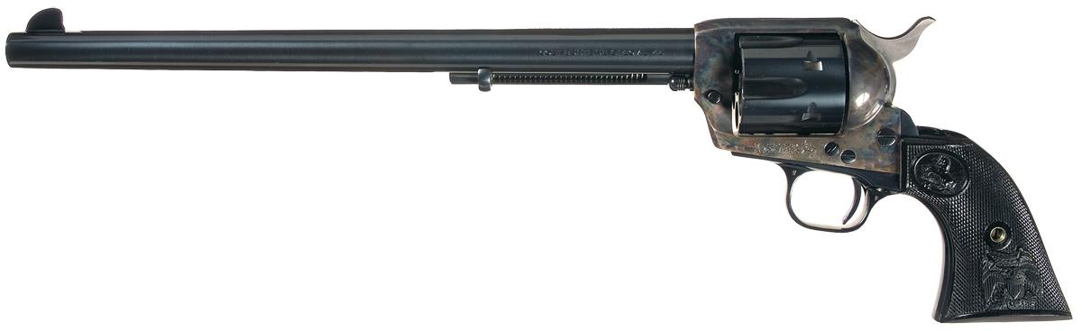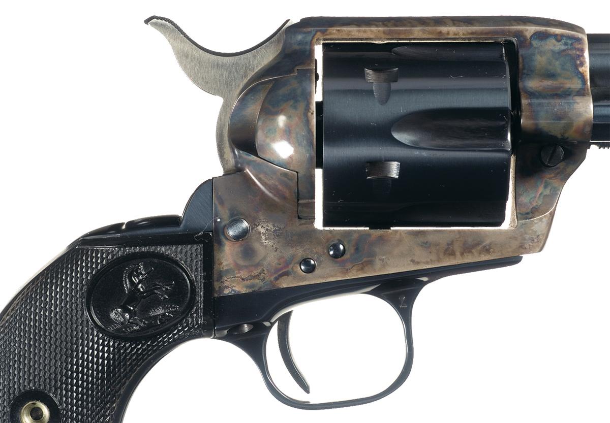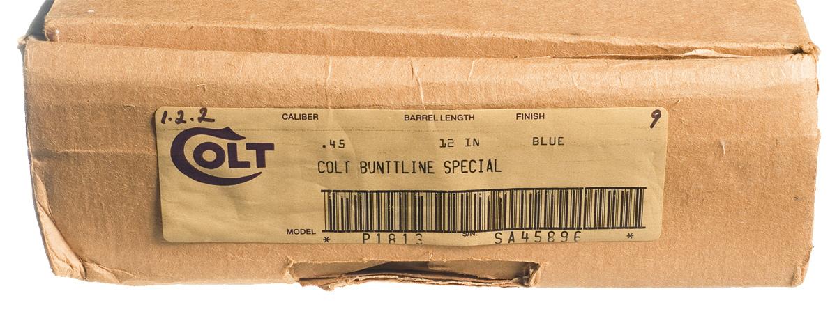 Condition: Excellent overall. Gun retains 99% plus of original blue finish with a very faint staggered drag line on the cylinder. 98% original case colors with some fading and a couple areas of minor discoloration, otherwise a majority of the case colors remain bright. Shipping box is good with end label inside.