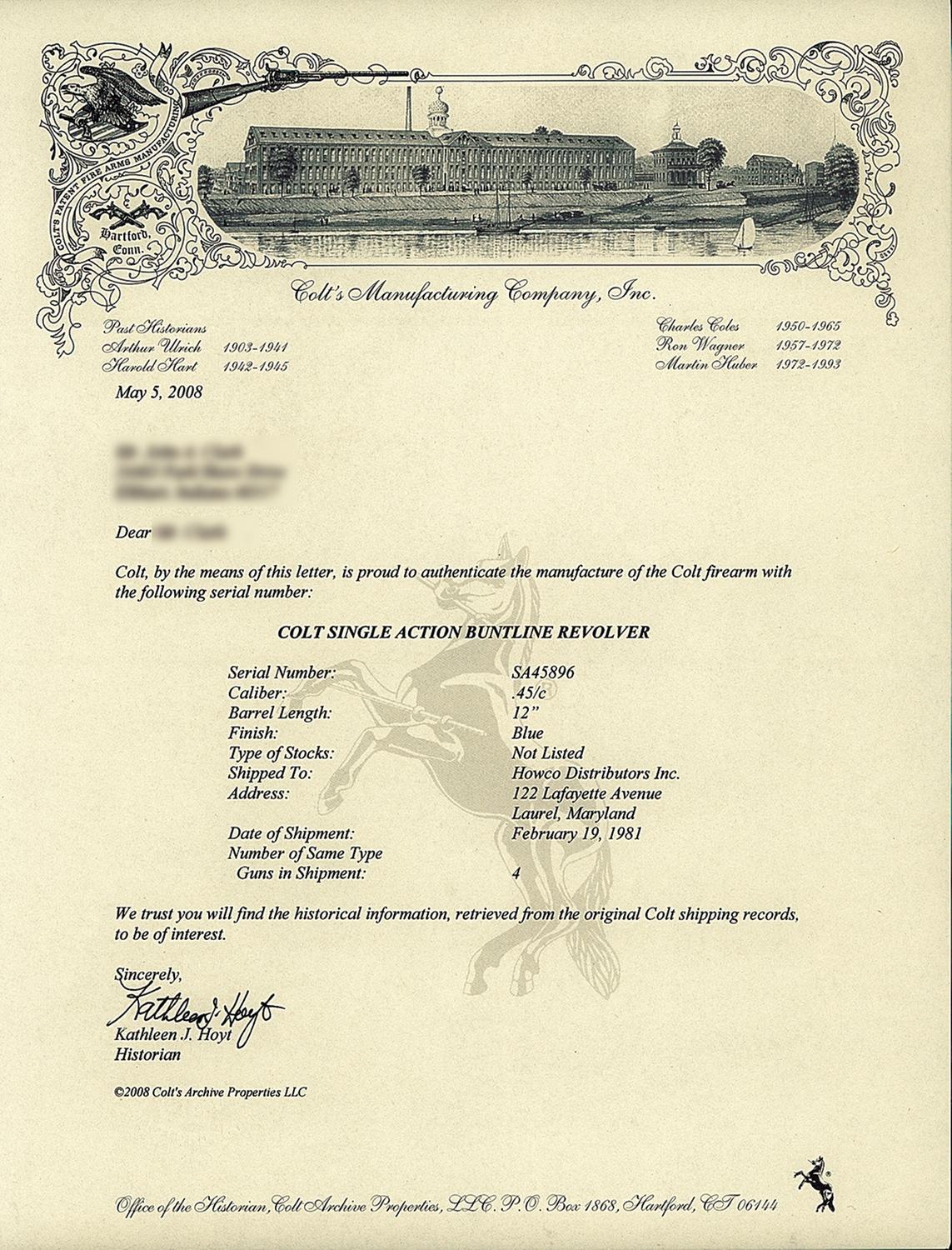 Produced in 1981. Patridge front and notch rear sights, with the standard one line address and caliber markings on the 12 inch barrel. Casehardened frame with standard markings. Rampant Eagle and American Eagle relief grips numbered to match. The front grip and back straps also have matching serial numbers as well as the inside the grips. The firearm is complete with original shipping box numbered to the gun and papers. A factory letter verifies the serial number, caliber, barrel length, blue finish, and shipped to address of Howco Distributors, Inc., 122 Lafayette Avenue, Laurel, Maryland on February 19, 1981 in a shipment of 4 guns.