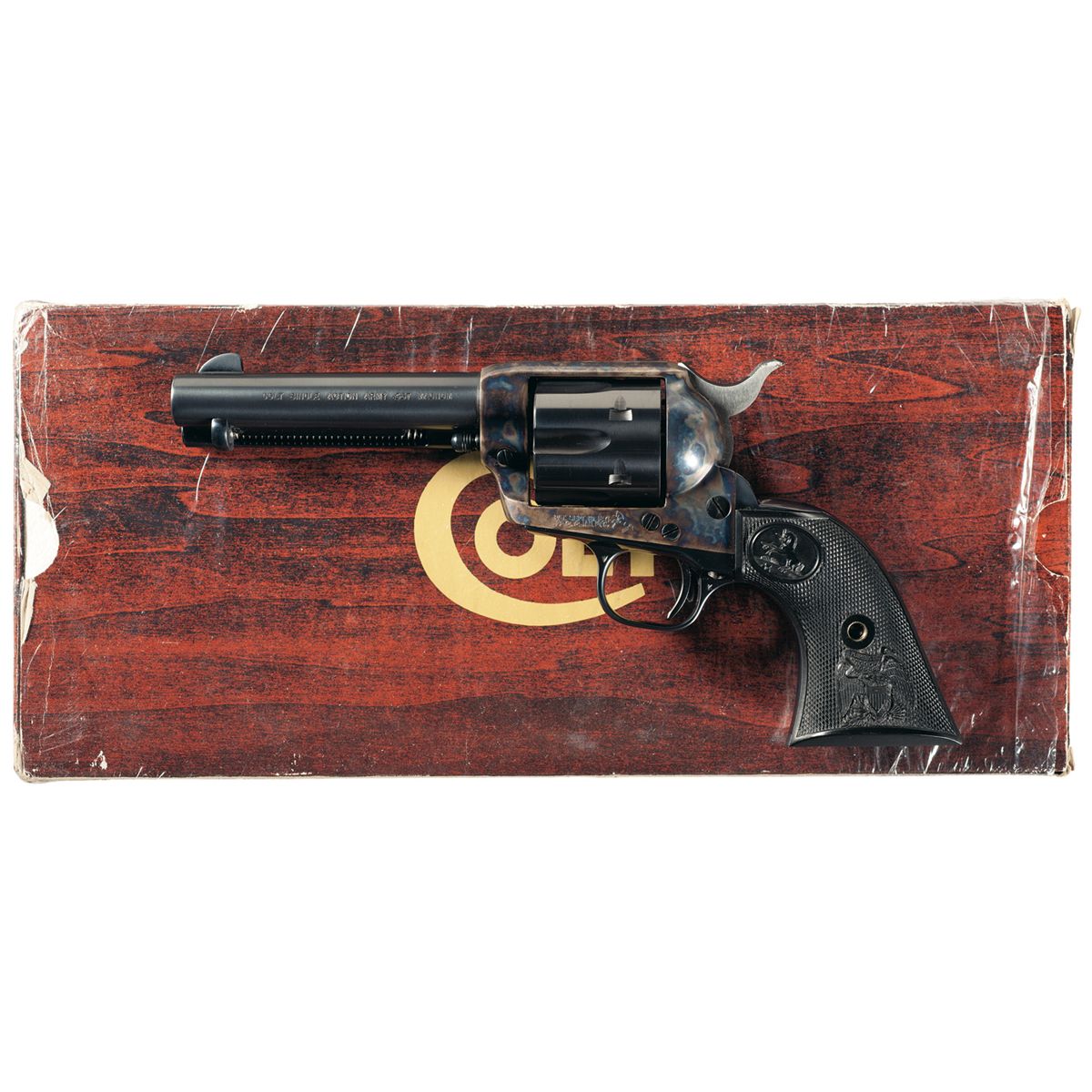 Standard one line barrel address, "COLT SINGLE ACTION ARMY .357 MAGNUM" on the left side and the left side of the frame is marked with the two line, three patent dates. Blade front sight, notch rear sights, and fitted with checkered Rampant Colt/American Eagle relief grips. Complete with the original box numbered to the gun.