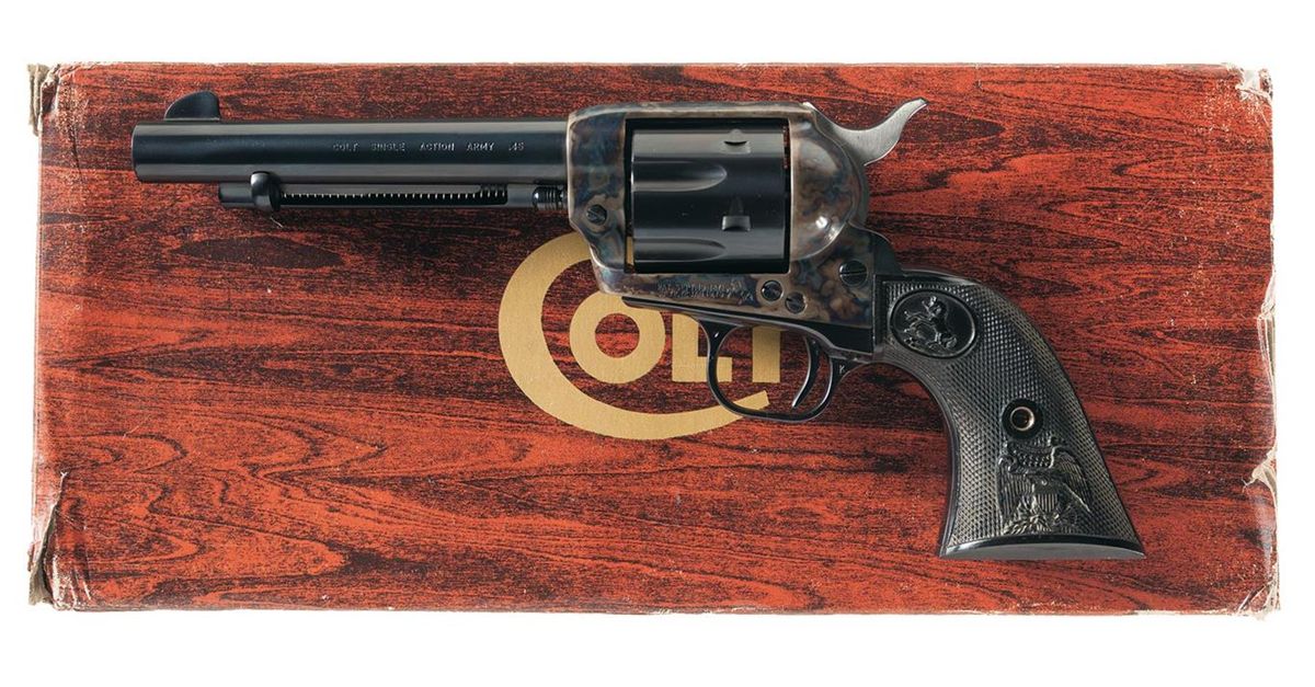 Manufactured in 1979. Standard markings and features. Matching serial number on frame and left side of grip straps under the grip and fitted with checkered Rampant Colt/American eagle relief grips numbered to the gun. Complete with one extra set of smooth walnut grips with Colt gold medallions and a factory "woodgrain" box numbered to the gun