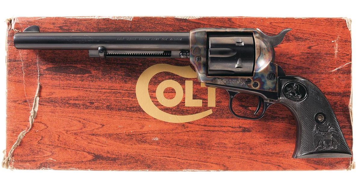 Excellent. The revolver retains 98% of the original blue finish with some light handling marks, some scuffing on the left side of the barrel and a very light cylinder drag line. The frame retains 99% original bright case colors. The grips are excellent with a small pressure dent on the right panel heel. The box is good with edge/corner wear and the end flaps showing some seam separation/tearing.