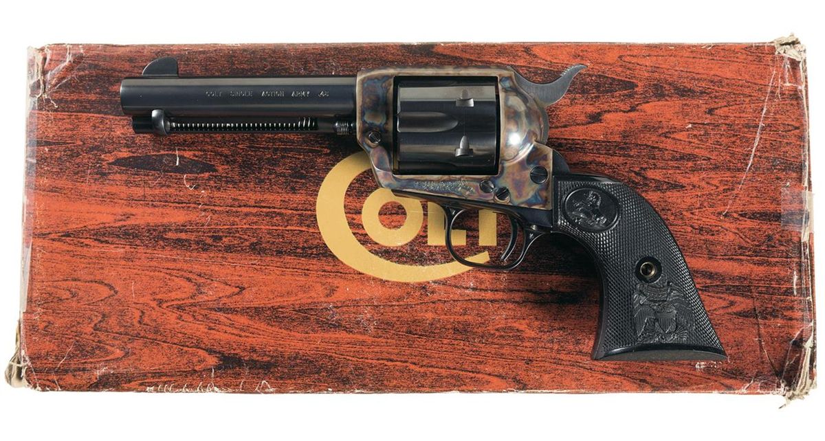 Manufactured in 1979. Standard markings and features. Matching serial number on frame and left side of grip straps under the grip and fitted with checkered Rampant Colt/American eagle relief grips numbered to the gun. Complete with factory "woodgrain" box numbered to the gun.