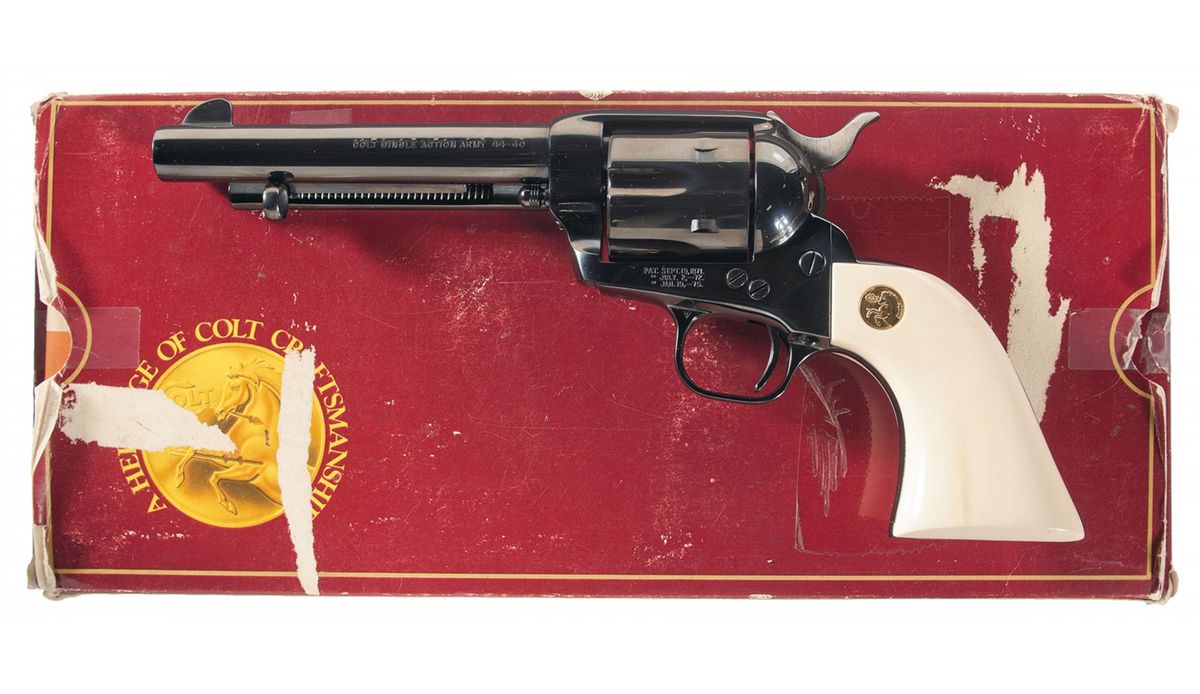 Manufactured in 1984 with fixed front and rear sights. Standard markings and features. All blued black powder frame with bullseye ejector housing Fitted with a ivory one-piece grip with the Colt gold medallions. This pistol comes with the original Colt factory shipping box numbered to the pistol with papers.