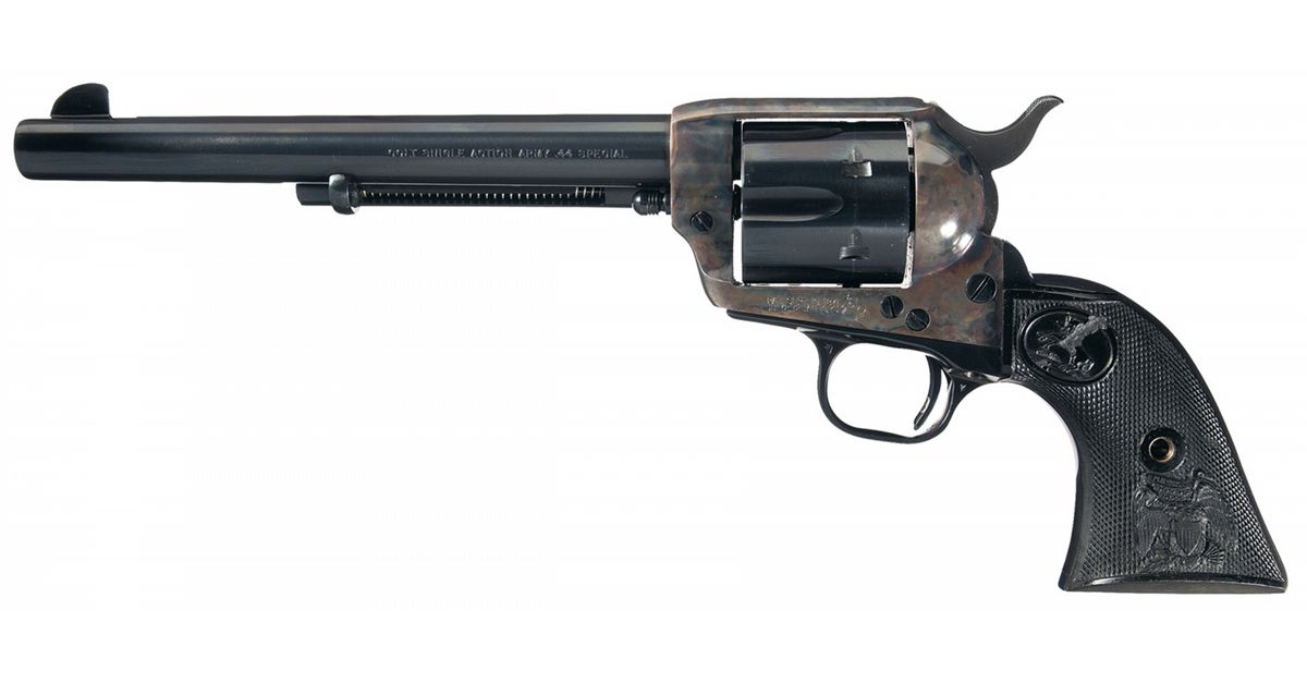 Condition: Excellent, 98% original blue finish with a drag line and some minor scratches on the cylinder and a patch of gray patina and minor surface oxidation on the back strap. 98% of the original case colors remain with some fading and a few minor scratches. The grips are very good with a moderate gouge through the Rampant Colt on the left side, crisp checkering.