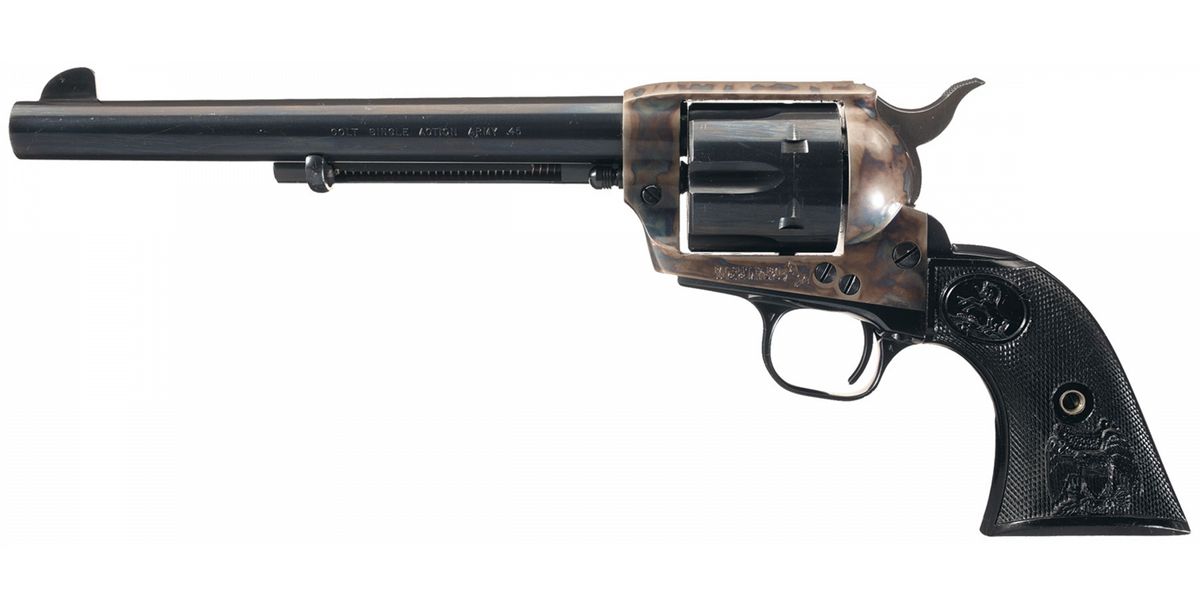Manufactured 1979. The top of the barrel is marked with the single line address and the left side is marked "COLT SINGLE ACTION ARMY 45". The left side of the frame is marked with the two line, three patent dates and the Rampant Colt. Matching serial numbers on the bottom frame and left side of grip straps under the grip. Fitted with checkered hard rubber Colt grips with the Rampant Colt and American Eagle.