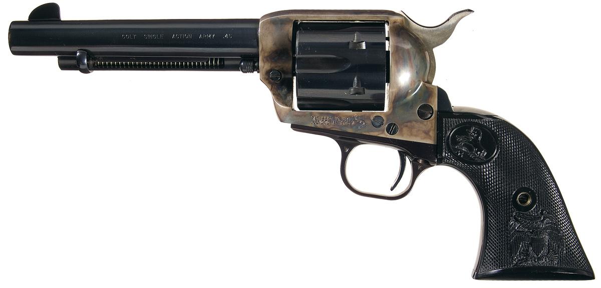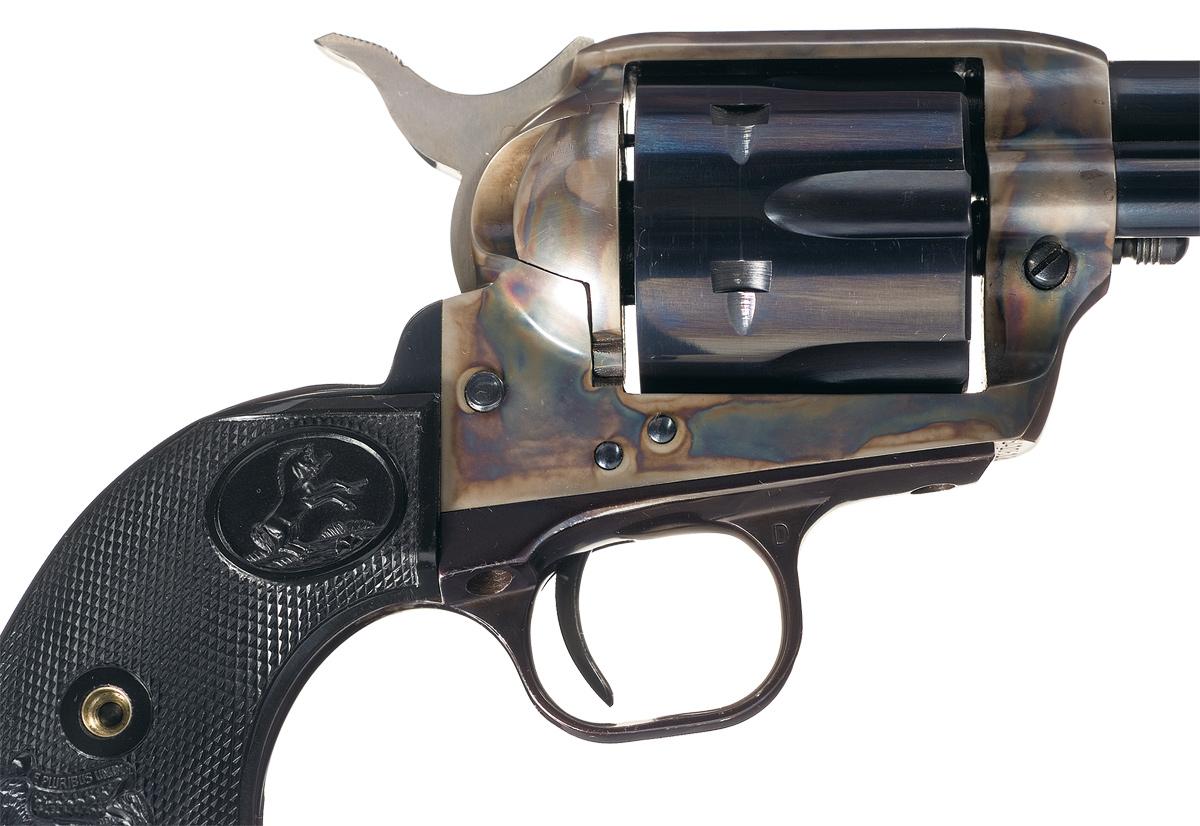 Condition: Excellent, with 98% of the original blue finishes with limited muzzle wear a few patches, and some speckling of gray on the gripstraps, and some scattered minor scratches (mostly on the cylinder), with a light drag line. The frame retains 99% plus of the original bright case colors. The grips are also excellent with the exception of a couple minor dings near the frame