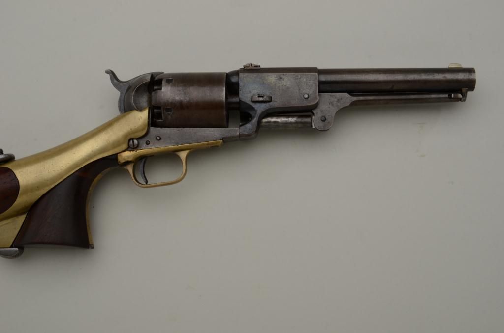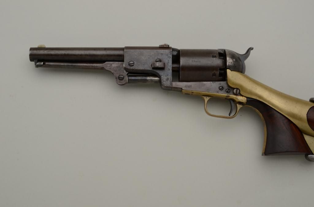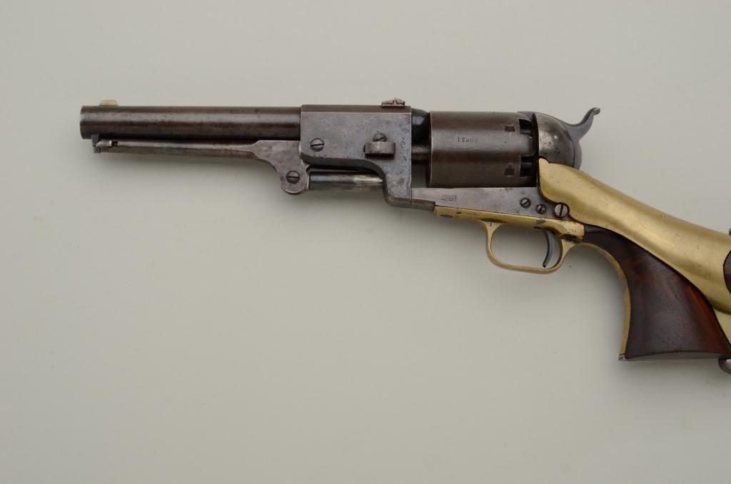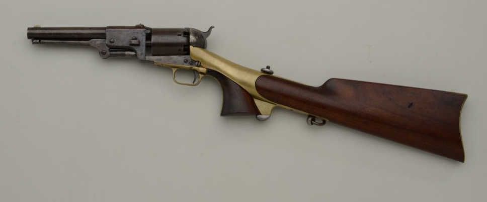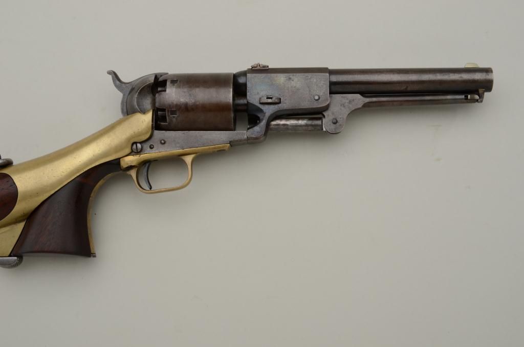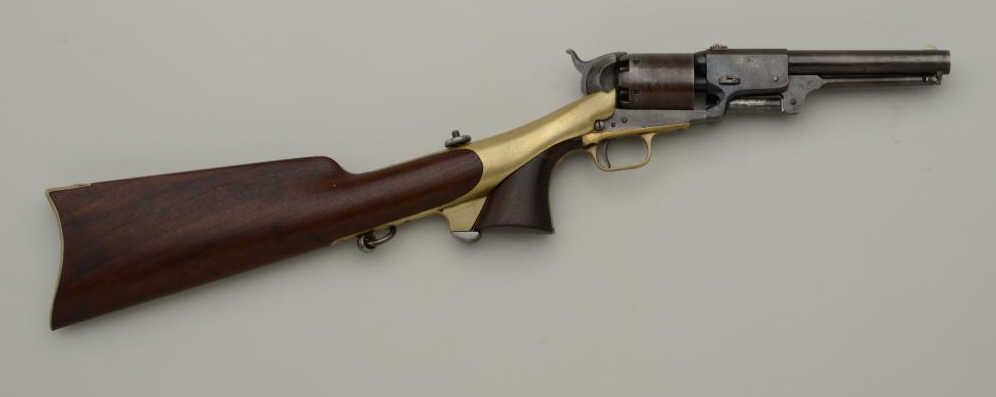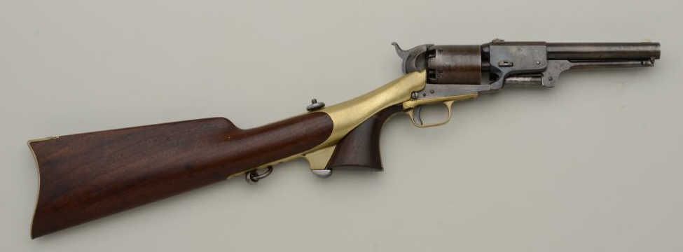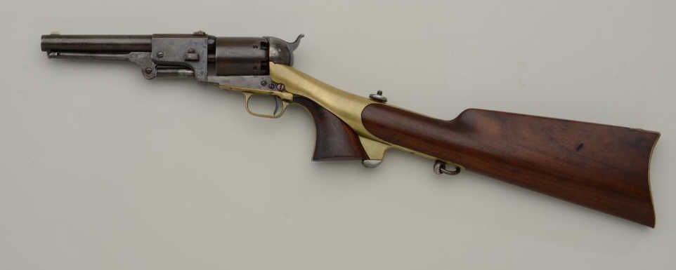 Colt Third Model Civilian Series Dragoon cut for shoulder stock with original stock, serial number 17262. The Dragoon shows a restored cylinder scene which has been re-rolled and an excellent replacement ofgrips. The barrel shows 40% to 60% original blue with some minor scratches and just normal aging. The barrel address is good though light where New York is stamped. The rear sight is an excellent replacement. Theframe shows 30% to 50% original case hardening that is toning nicely and the frame and lever show a like amount of colors. There is some very bright original blue beneath the loading lever and all visibleserial numbers are matching. This Dragoon was very sharp and crisp before the cylinder and grips were restored. The stock has been renumbered to match the pistol but is an original antique Dragoon stock from civilianseries. The wood has been cleaned lightly and professionally and is at least very good with excellent wood to metal fit. We have known this colt for more than 35 years where it has rested in a local collection since