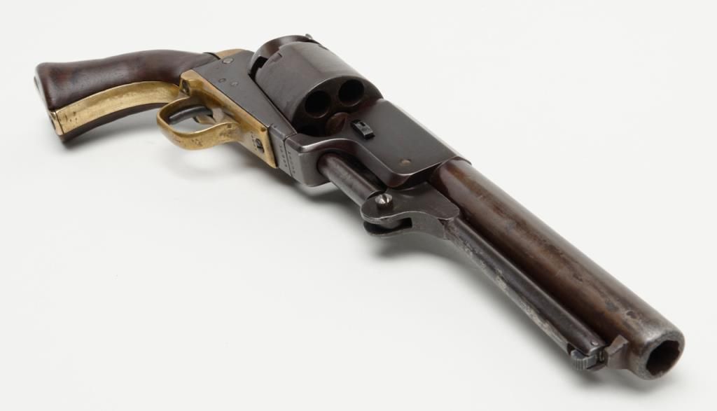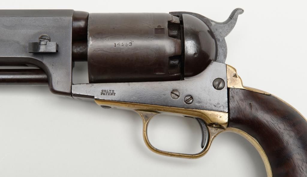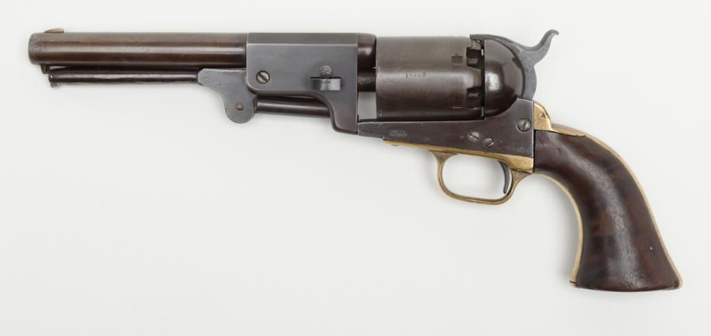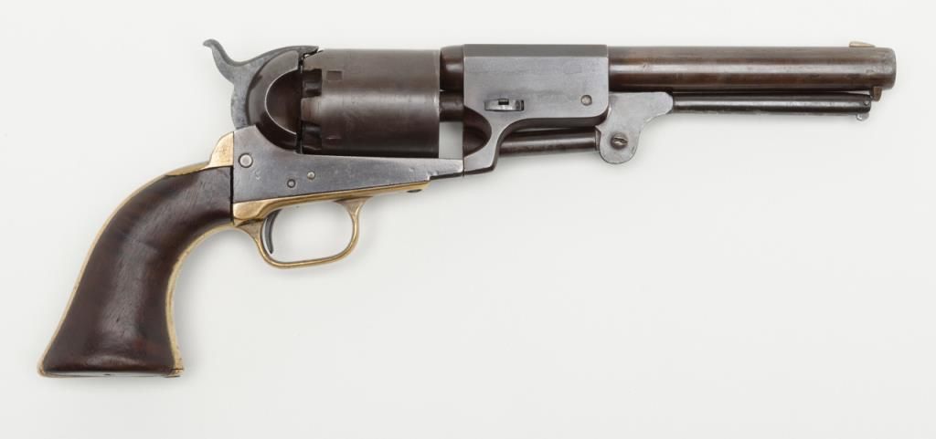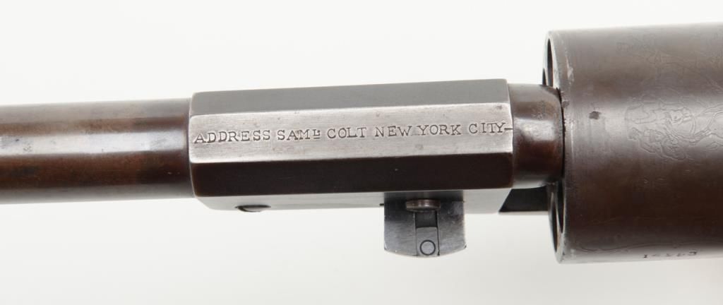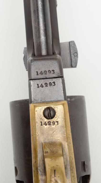 Colt Third Model Dragoon percussion revolver, .44 cal., 7-1/2” barrel, wood grips, brass straps, #14293 in overall fair to good condition showing a dark brown patina to metal surfaces, matching visible numbers except backstrap where number hasbeen removed long ago; replaced wedge; cylinder scene has been re-rolled, action currently not working and in need of the attention of a gunsmith; grips are well-worn but overall good; a decent Dragoon that has had some restoration.(Antique). Est.: $2,000-$4,000.
