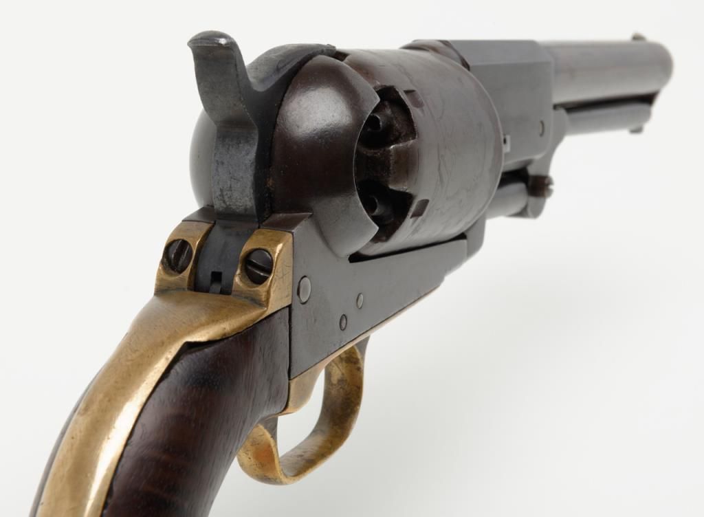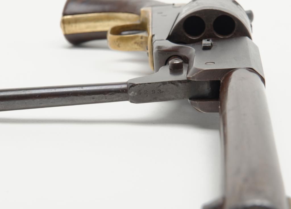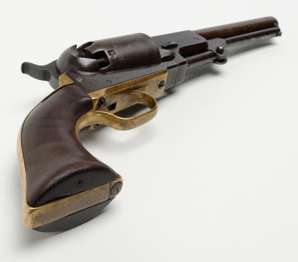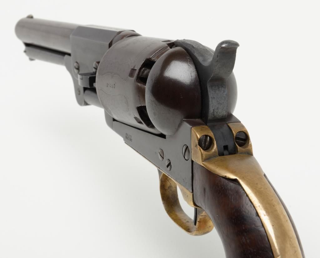 Colt Third Model Dragoon percussion revolver, .44 cal., 7-1/2” barrel, wood grips, brass straps, #14293 in overall fair to good condition showing a dark brown patina to metal surfaces, matching visible numbers except backstrap where number hasbeen removed long ago; replaced wedge; cylinder scene has been re-rolled, action currently not working and in need of the attention of a gunsmith; grips are well-worn but overall good; a decent Dragoon that has had some restoration.(Antique). Est.: $2,000-$4,000.