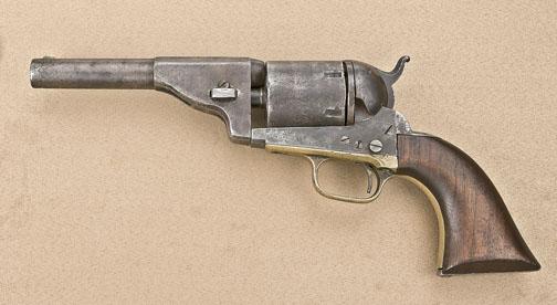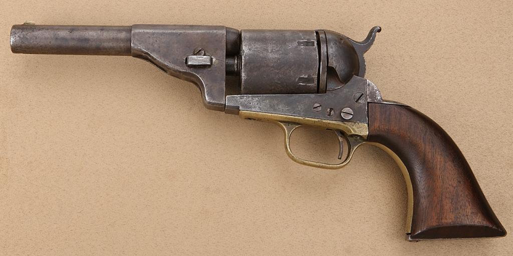 Colt Third Model Dragoon revolver, converted to cartridge, likely on the frontier, .44 cal., cut-down barrel to 5-3/4”, brown finish, wood grips, #16921. This gun is in overall good condition as period modifiedshowing a dark brown patina with scattered areas of erosion and some moderate pitting on the cylinder, blacksmith-style conversion, good action, dark bore with strong rifling, rammer removed; cut for shoulder stockvariation, “U.S.” marked frame, iron backstrap, brass trigger guard; overall good grips with wear and some scattered old mars from carry and storage. This gun has the classic appearance of what is frequentlyknown as a “Mormon Avenger” referring to a handgun modified for concealment. Est.: $2,500-$5,000.