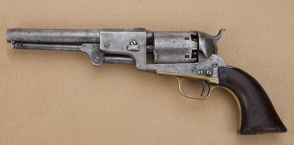 Colt Third Model U.S. Dragoon percussion revolver, cut for shoulder stock, .44 cal., 7-1/2” barrel, blue and case hardened finish, wood grips, #17469. This gun is in overall good condition showing a light grey patinaover general pin prick pitting with some spots of erosion, cylinder shows scattered old knackering, overall good bore and action, all matching serial numbers including the wedge and arbor; iron backstrap, brasstrigger guard; grips are overall good showing wear and scattered old mars including areas at both grip bottoms where butt was likely used to drive tacks. Est.: $3,000-$6,000.