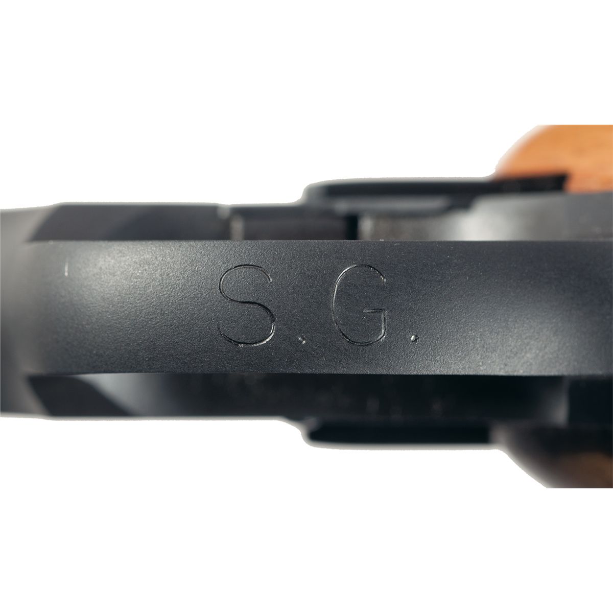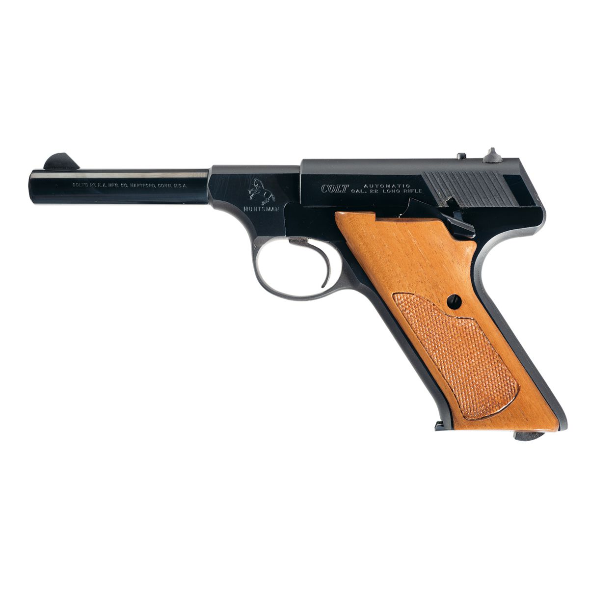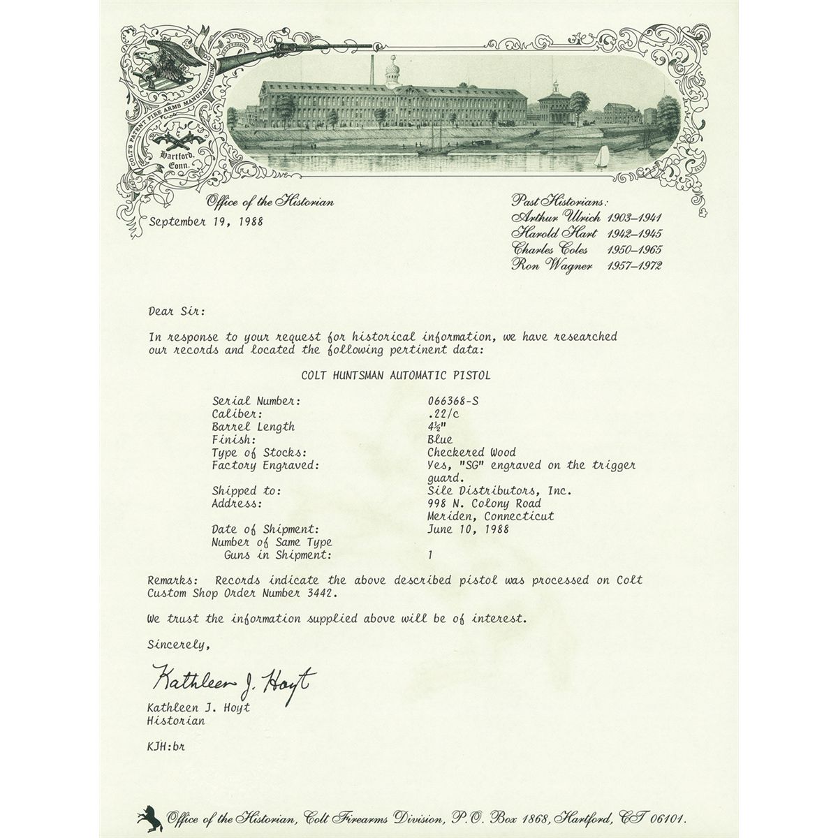 Manufactured in 1988. The left side of the barrel is marked with the one line address, the left side of the frame is marked with the Rampant Colt over "HUNTSMAN", the right side of the frame is marked with the serial number and the left side of the slide is marked "COLT AUTOMATIC/CAL. 22 LONG RIFLE". The bottom of the trigger guard is factory engraved "S.G.". Blade front and windage adjustable rear sights, smooth trigger, blue magazine marked "CAL. .22 L.R." on the bottom, polished barrel and flat sides with the remaining surfaces matte blue and fitted with checkered light colored walnut grips. This pistol was used as a Colt Show Gun. The accompanying factory letter verifies the serial number, caliber, barrel length, blue finish, checkered wood grips, factory engraved "S.G." on the trigger guard and that it was shipped as 1 on Colt Custom Shop Order number 3442, to Sile distributors, Inc., 998 N. Colony Road, Meriden, Connecticut on June 1, 1988. Complete with the original box numbered to the gun, with Colt Custom Gun Shop end label.