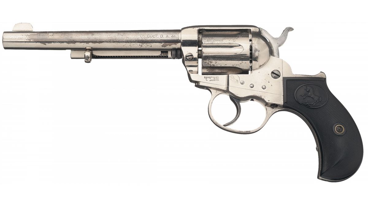 Produced in 1909. Fixed sights, with the two line Hartford address on top of the barrel and "COLT. D.A. 41" on the left. The left side of the frame is marked with the three line, three date patent markings, followed by the circled Rampant Colt. Loading gate is unnumbered. Factory star (six-point rework) is present on right rear trigger guard. Equipped with a "bulls eye" ejector rod head, niter blue trigger and hammer and two piece checkered hard rubber grips with the Rampant Colt in an oval at the tops.