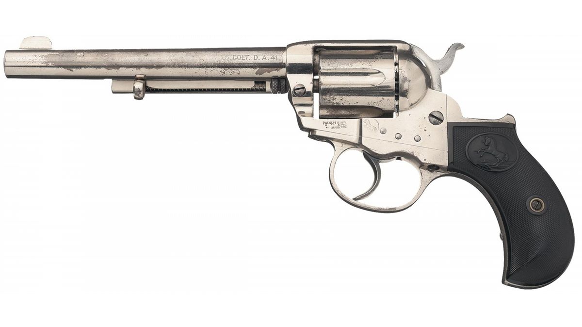 Manufactured in 1909. Fixed sights with the two line Hartford address on top of the barrel and "COLT. D.A. 41" on the left. The left side of the frame is marked with the three line, three date patent markings, followed by the circled Rampant Colt. Loading gate is unnumbered. Factory star (six-point rework) is present on right rear trigger guard. Equipped with a "bulls eye" ejector rod head, niter blue trigger and hammer and two piece checkered hard rubber grips with the Rampant Colt in an oval at the tops.