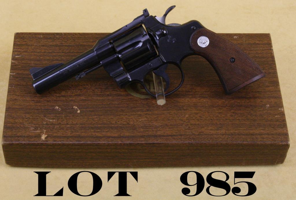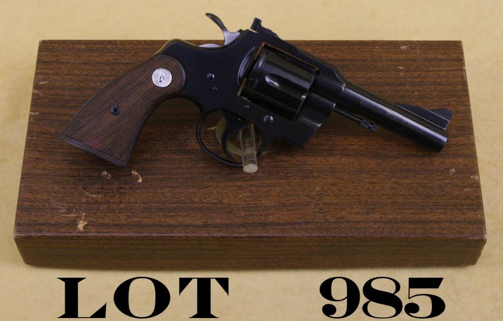 Colt Trooper .357 DA revolver, .357 magnum cal., 4” barrel, blue finish, checkered Colt medallion wood grips, in original factory two piece wood grained cardboard box, #58015. This gun is in overall like new conditionshowing approx. 99%+ original finish, fine bore, action and markings; fine grips; box is in overall very good + condition with a couple of mars to the top of the box from storage. Est.: $400-$800.
