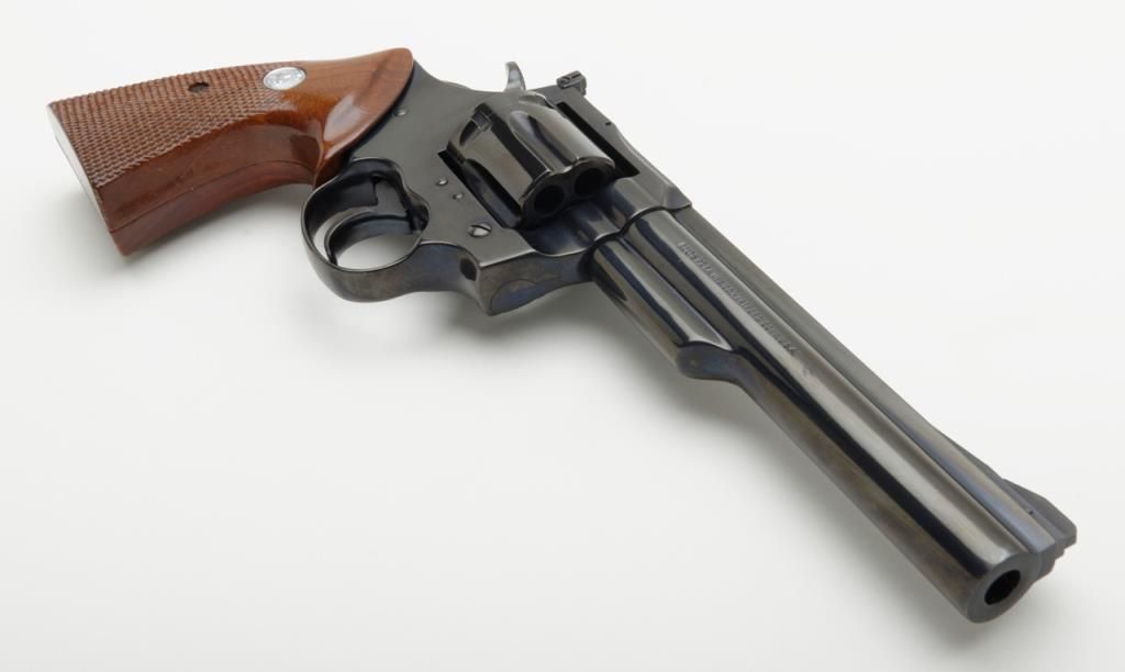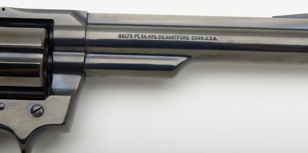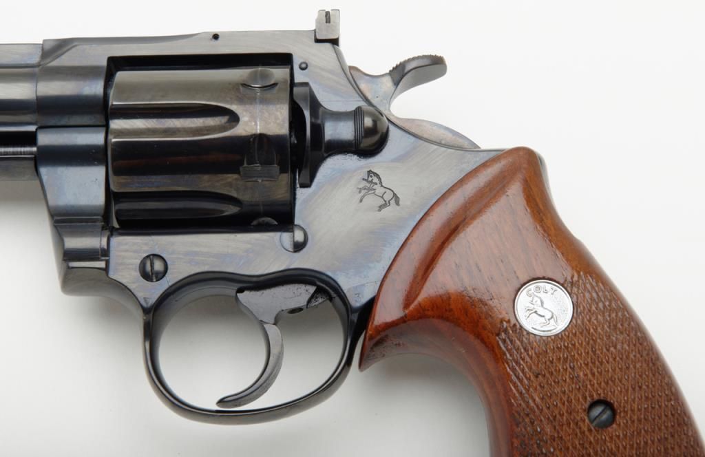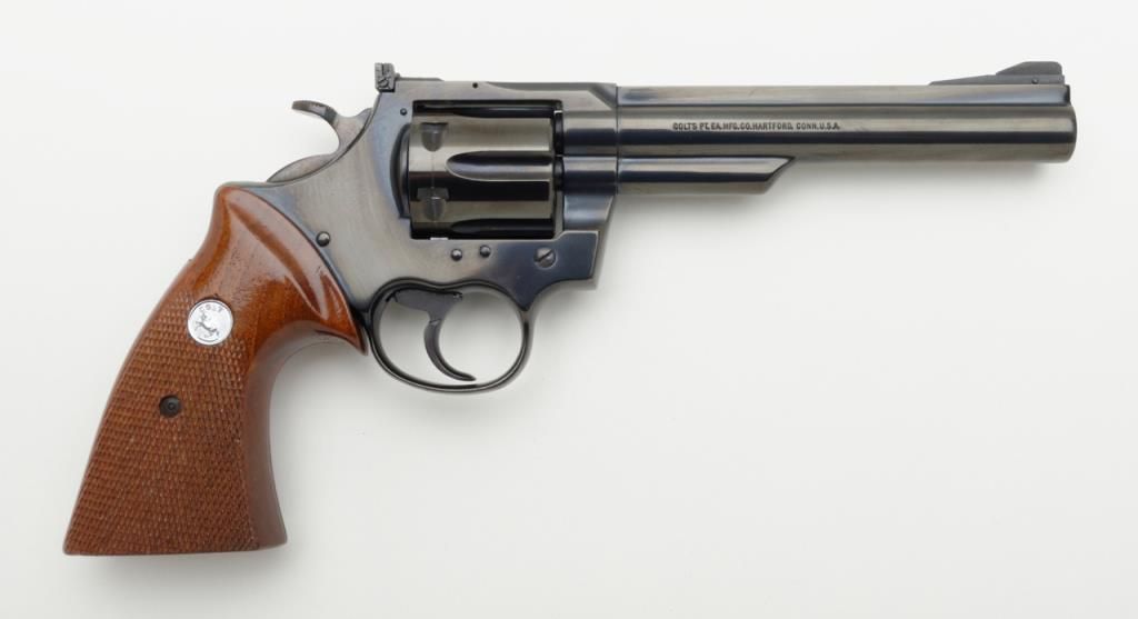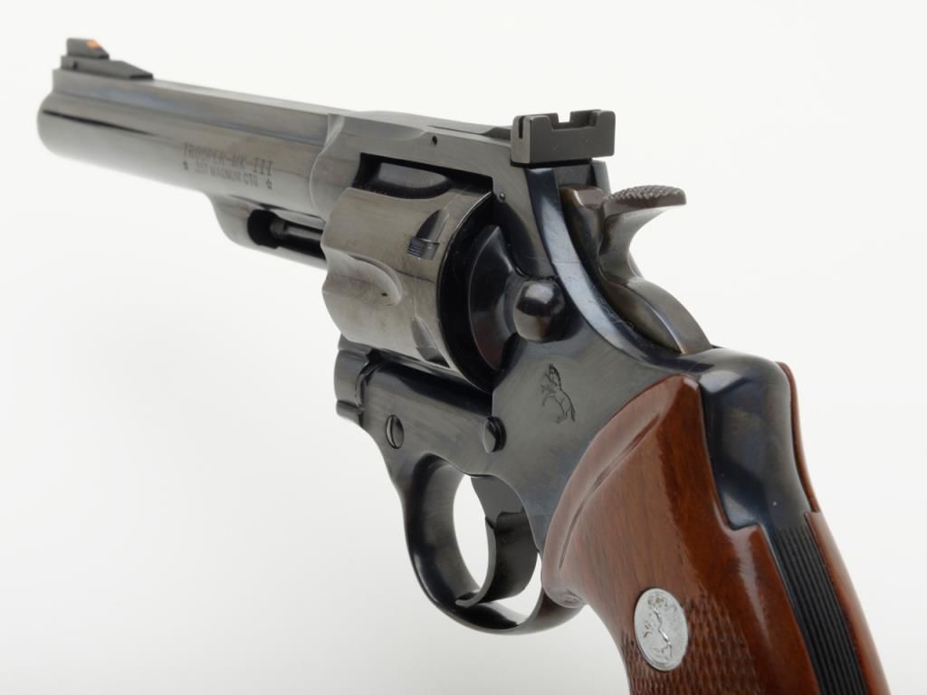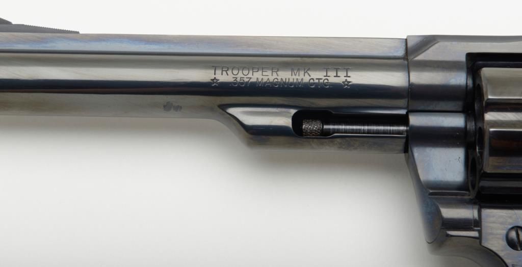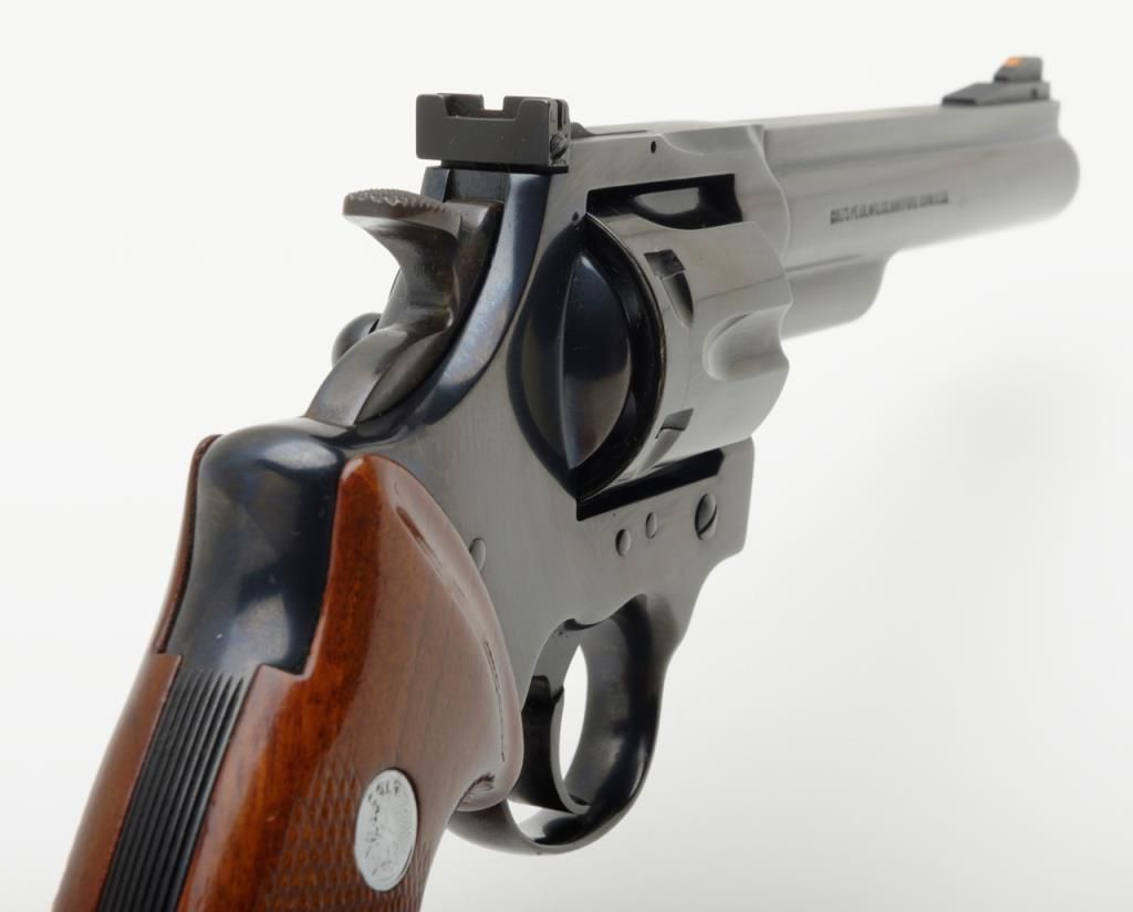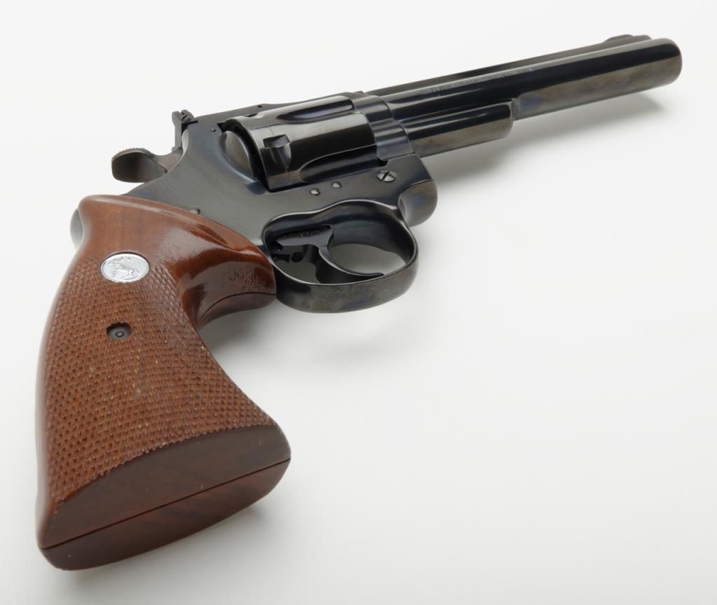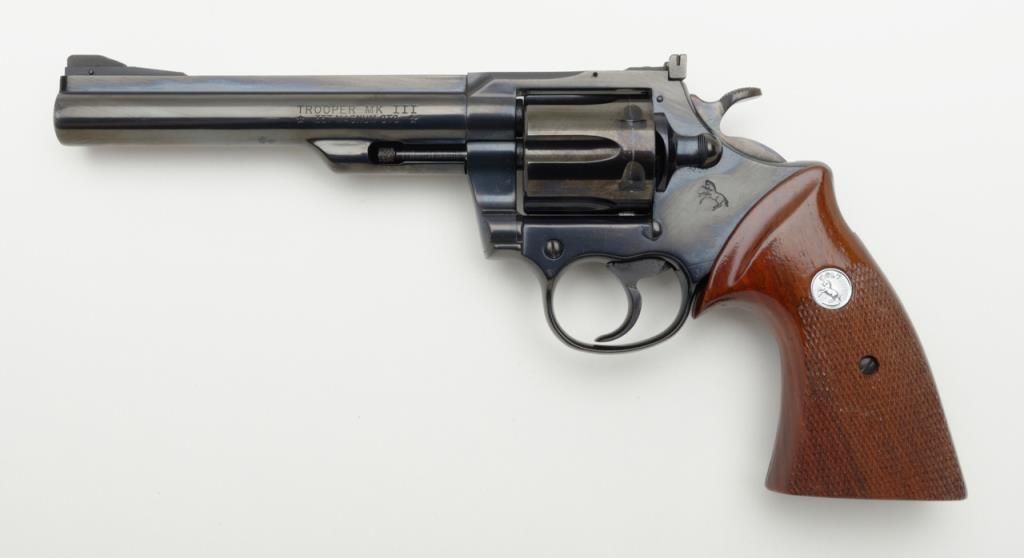 Colt Trooper III revolver, cal. .357 Magnum, serial #9273J. The pistol is in very good to fine condition with a 6” barrel. The pistol retains the majority of its original blued finish with a smooth action and crisp markings. The checkered wood, medallion grips are in fine condition showing little use, while the muzzle shows a slight loss of finish consistent with holster wear. The bore is very good and may clean to excellent, while the hammer shows most of its original case color. Est.: $300-$500 (Modern/PPT)