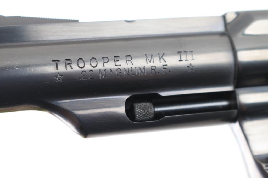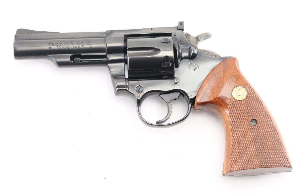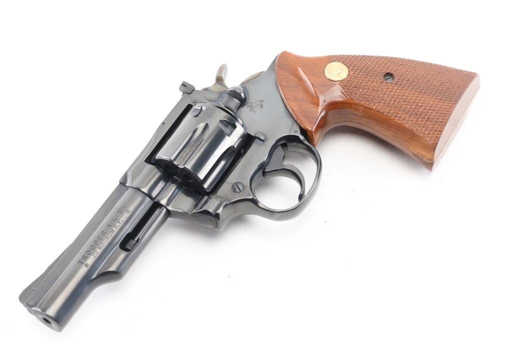 Double/Single action revolver features blued finish, checkered wood grips with Colt logo medallions, 4" ribbed barrel, adjustable sights, wide smooth target trigger, case color hammer with wide checkered spur, swing-out 6 shot fluted cylinder. Manufactured 1979. Bore and charge holes are excellent. Retains 99% deep blue, with faint tracking on the cylinder. Grips are excellent. Action is smooth. Good lock-up. NRA Condition-Excellent. Modern Firearm.