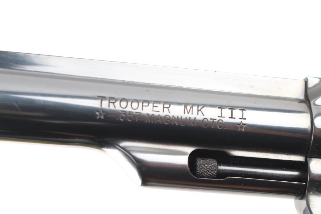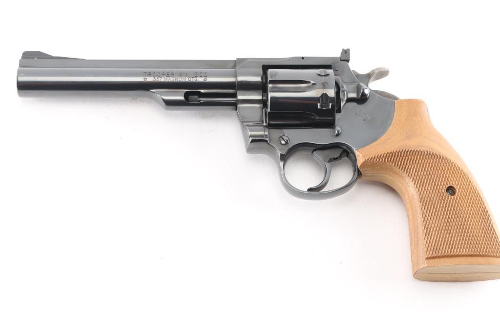 Double-action revolver chambered in .357 Magnum, circa 1960. Features a blued finish, 6" barrel with solid top rib, shrouded ejector rod, raised & pinned ramp front sight, pinned adjustable square notch rear sight, fluted six-shot cylinder, case hardened smooth trigger, case hardened knurled wide hammer spur, checkered target grips and serrated backstrap. Bore is bright with strong rifling. Retains approx. 98% finish with little to no scratches and or losses. Grips are excellent. Action is smooth with tight lockup. NRA condition is excellent.*** Modern Firearm ***
