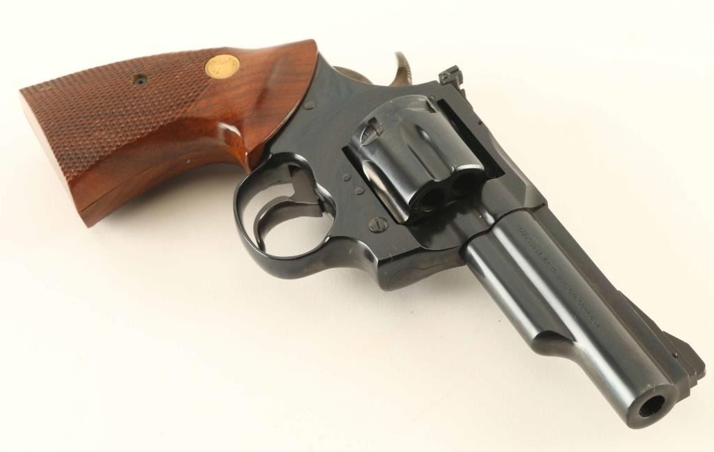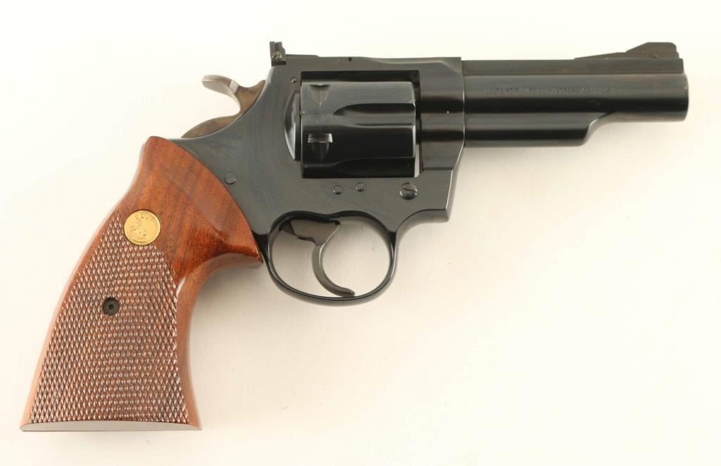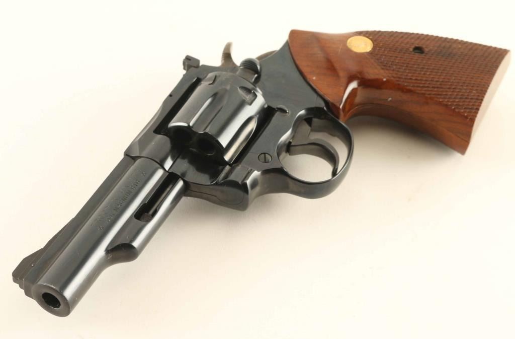 Double action revolver chambered for 357 Magnum. Features blued finish, checkered wood grips with gold colored Colt medallions, adjustable sights, 4" barrel, six shot swing-out cylinder, wide checkered hammer, wide smooth trigger. Bore is excellent; needs cleaning. Bluing is 95% with beginnings of holster wear at muzzle, thin lines of bare metal appearing on sharp edges and drag line on cylinder. Grips are in very good or better condition with minor scuffs and dents in a few places. Includes a very good condition Bianchi tan leather belt slide holster with thumb break. Condition is NRA Excellent ***Modern Firearm***