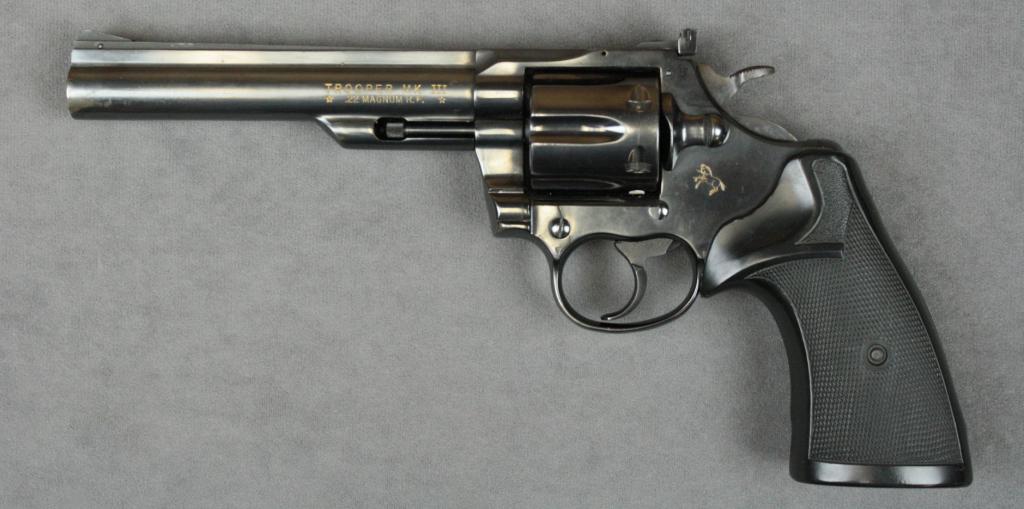 Colt Trooper MK III DA revolver, .22Magnum RF cal., 6” barrel, blue finish, Pachmayr checkered combat hard rubber grips, #Y40550. This gun is in overall fine condition with adjustable rear sight and ramp front sight,single action only for target shooting, very good to fine bore, crisp action and markings, approx. 90% original finish with loss confined primarily to the muzzle from holster wear. Est.: $300-$600.