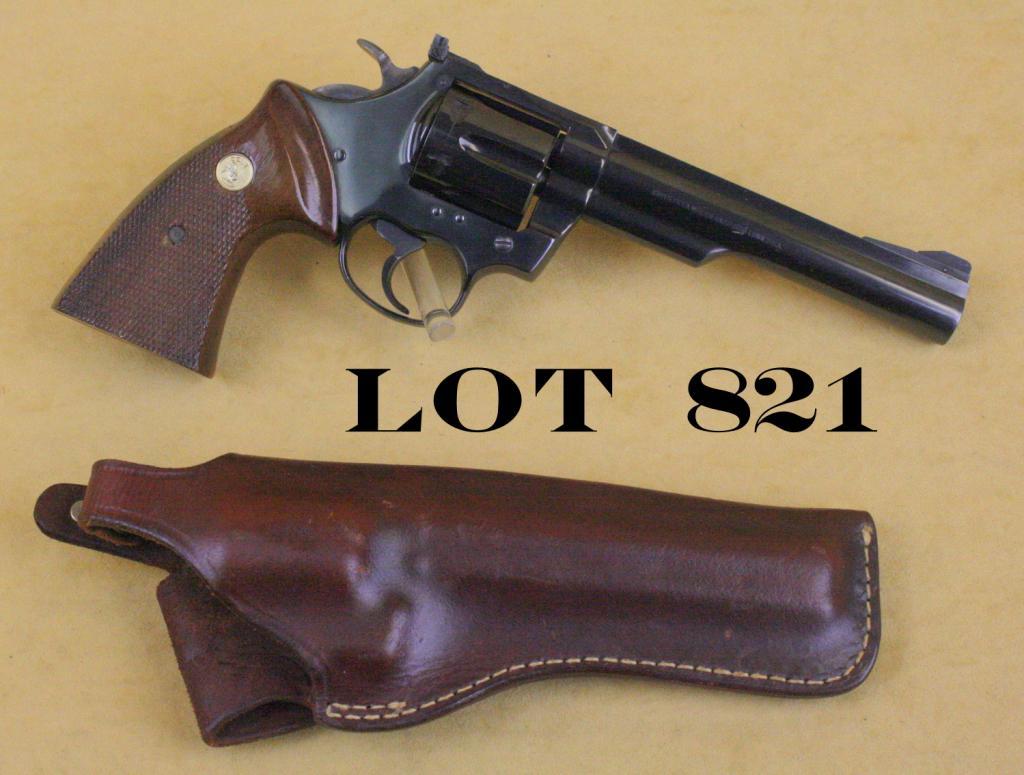 Colt Trooper MK III DA revolver, .357 Magnum cal., 6” barrel, blue finish, combat checkered gold medallion wood grips, #12496L. This gun is in overall fine condition showing approx. 98%+ original finish, verygood to excellent bore, crisp action, sharp markings, very good grips with just a couple of small scratches from storage and handling; accompanied by a leather holster. Est.: $300-$500.