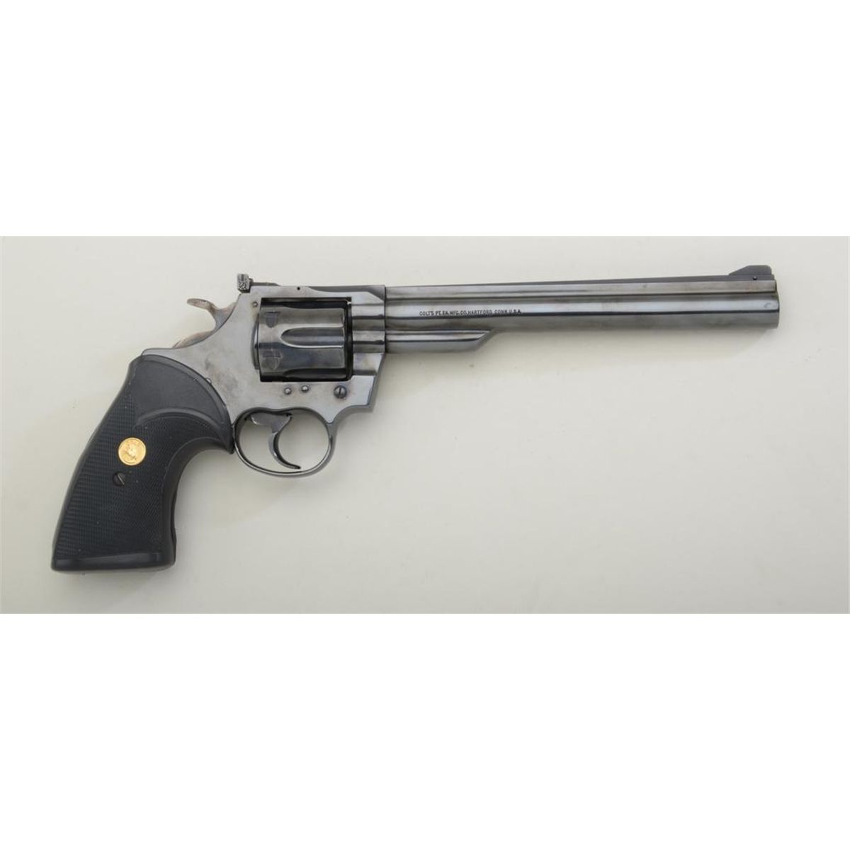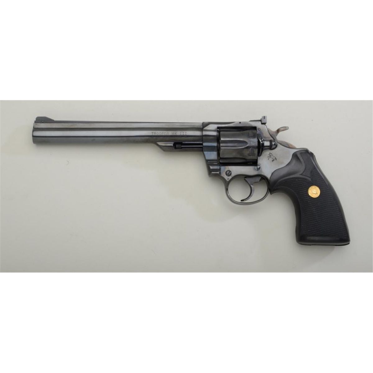 Colt Trooper MK III DA revolver, .357 Magnum cal., 8” barrel, black finish, Pachmayr checkered Colt gold medallion hard rubber grips, #67668L. This gun is in overall fine to excellent condition showing the majorityof its original factory finish, fine bore, action, markings and grips. Est.: $300-$500.
