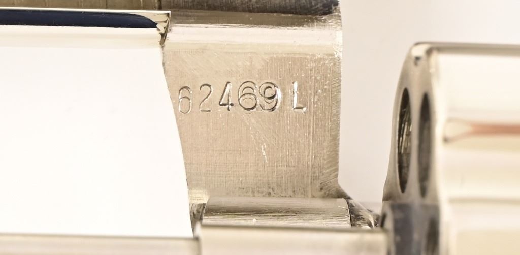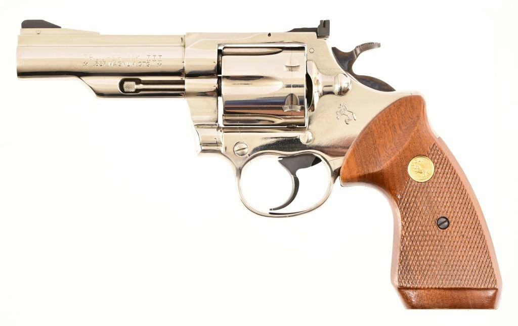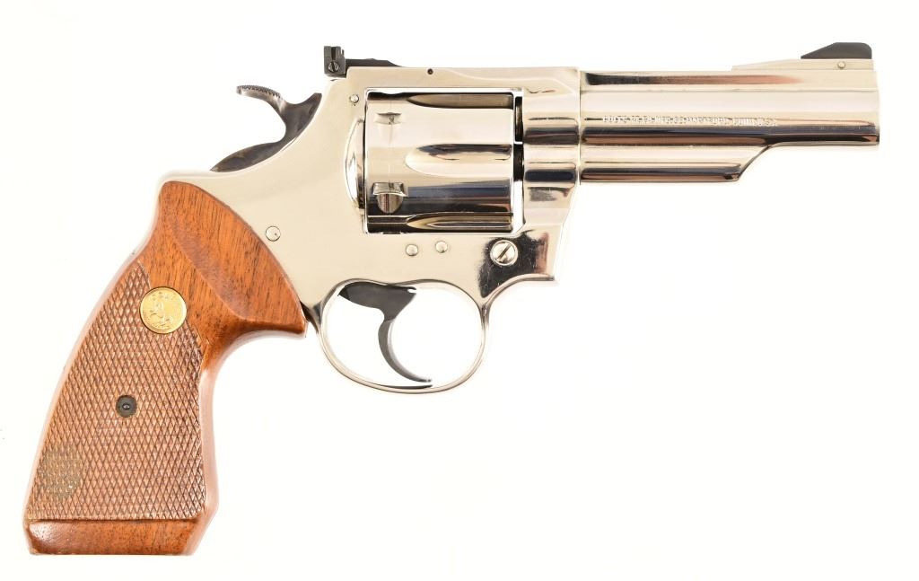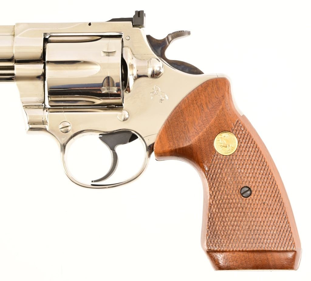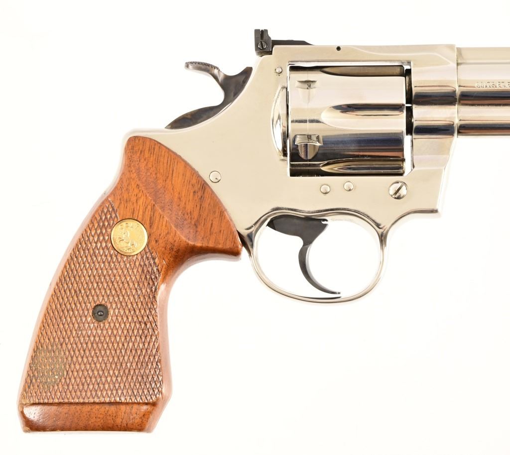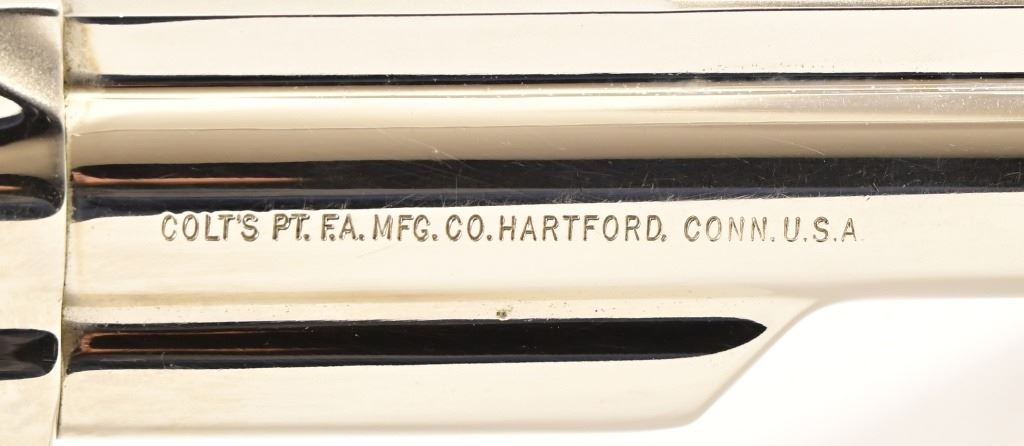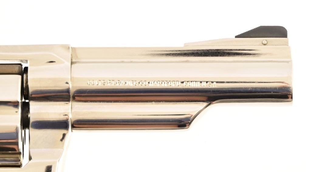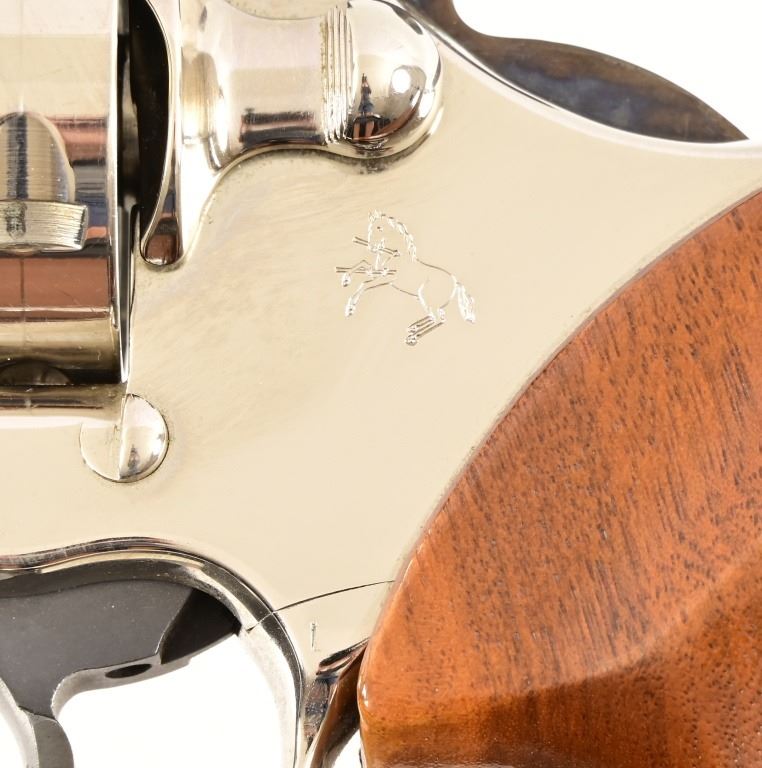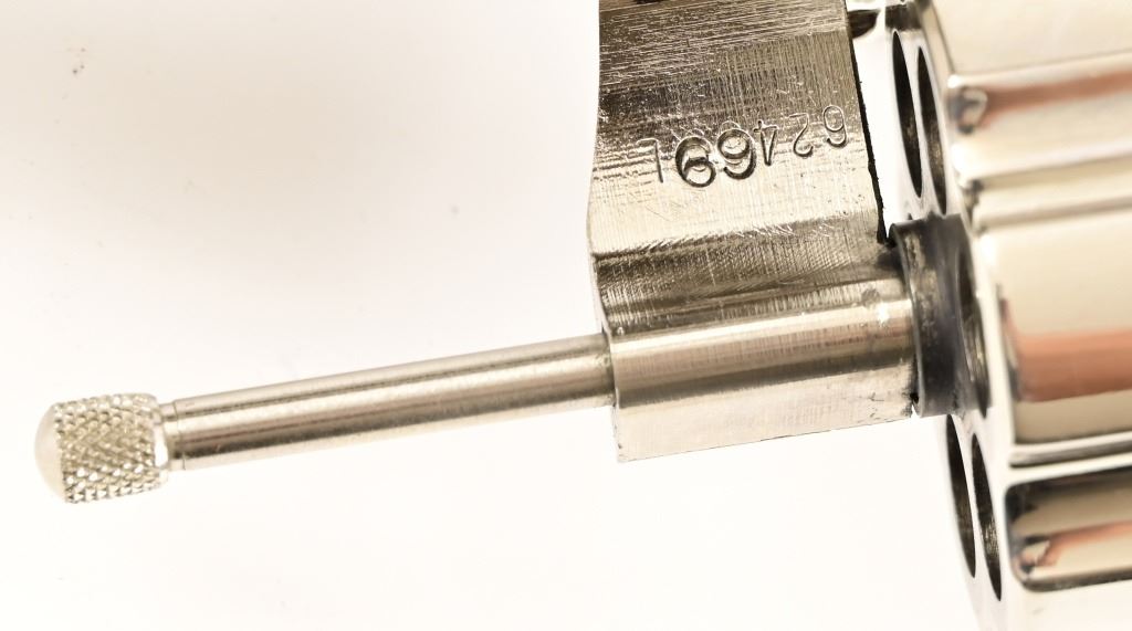 S/N 62469L. Nickel plated, 4" barrel, Rampant Colt medallion checkered wood grips. Modern