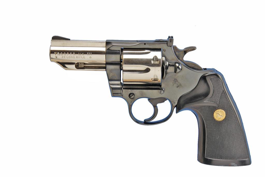 Colt Trooper MarK III Cal .22LR SN:Y25559 Double action medium frame 6 shot revolver. Pinto finish, blued frame and nickel barrel & cylinder, black checkered grips, 3" full lug barrel, adjustable sights, good bore and action. Condition: Excellent butDouble action medium frame 6 shot revolver. Pinto finish, blued frame and nickel barrel & cylinder, black checkered grips, 3" full lug barrel, adjustable sights, good bore and action. Condition: Excellent but has been fired. Appearsto be factory original finish and barrel length but have no letter which should be obtained.