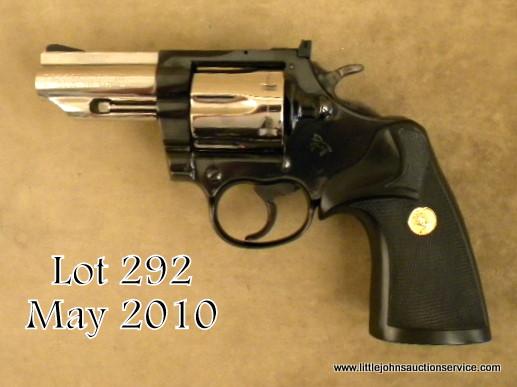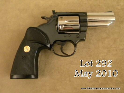 Colt Trooper Mark III Model DA revolver, .22LR cal., scarce 3” barrel, blued frame, nickeled cylinder and barrel, Colt medallion Pachmayr checkered combat grips, #Y25559. This unusual features gun is in overall excellent conditionshowing what appears to be approx. 99%+ original factory finish and possibly a special order gun given the nickel accents and the non-standard barrel length; the action is crisp, markings strong and very good bore and grips. A call to the Colt factory historian on this gun may reveal interesting information. Est.: $400-$600.