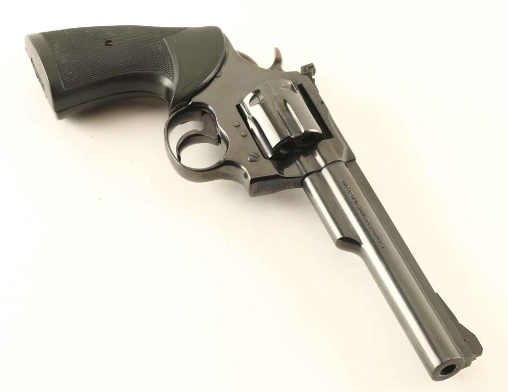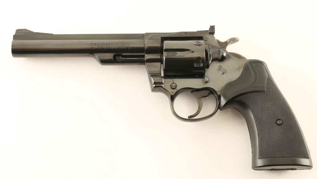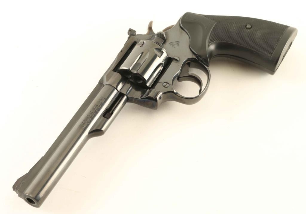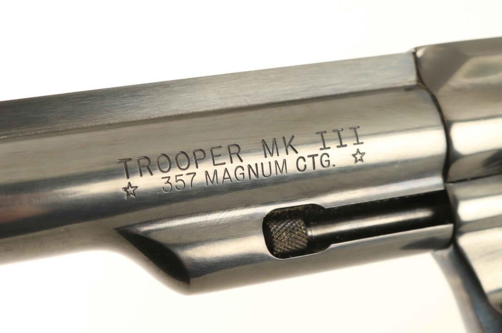 Quality double-action revolver chambered in .357 Magnum, manufactured circa 1979. The Trooper was designed to be the target-grade version of the MK III series. Features a blued finish, 6" barrel with solid top rib, shrouded ejector rod, raised & pinned ramp front sight, adjustable rear sight, fluted six-shot cylinder, smooth trigger, case hardened hammer with knurled wide spur and two-piece Pachmayr Presentation checkered black rubber grips. Revolver retains approximately 97%+ of it's original blued finish showing a drag line on the cylinder and some scattered handling marks/losses. Action is very smooth with very good lock-up & a light single-action trigger pull, the bore is excellent and the rubber grips are fine. Condition is NRA Excellent. ***Modern Firearm***