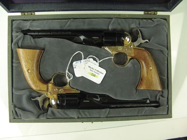 Pair of collector grade, special edition, .22 short cal. "dueling pistols" with black barrels and cylinders, gold plated frames and grip straps, and original Colt wooden case. Very good condition. S/Ns 21431 & 21432.