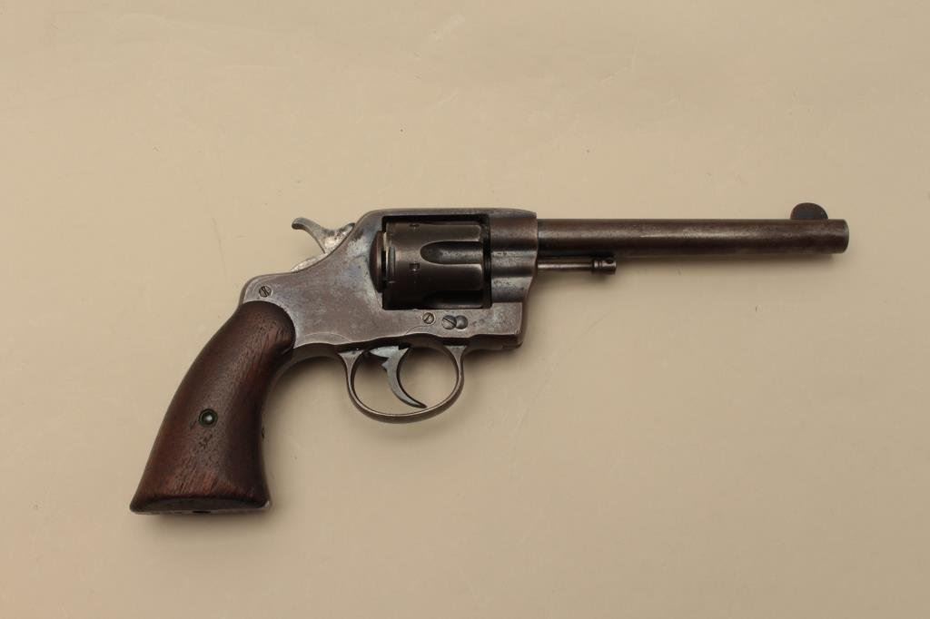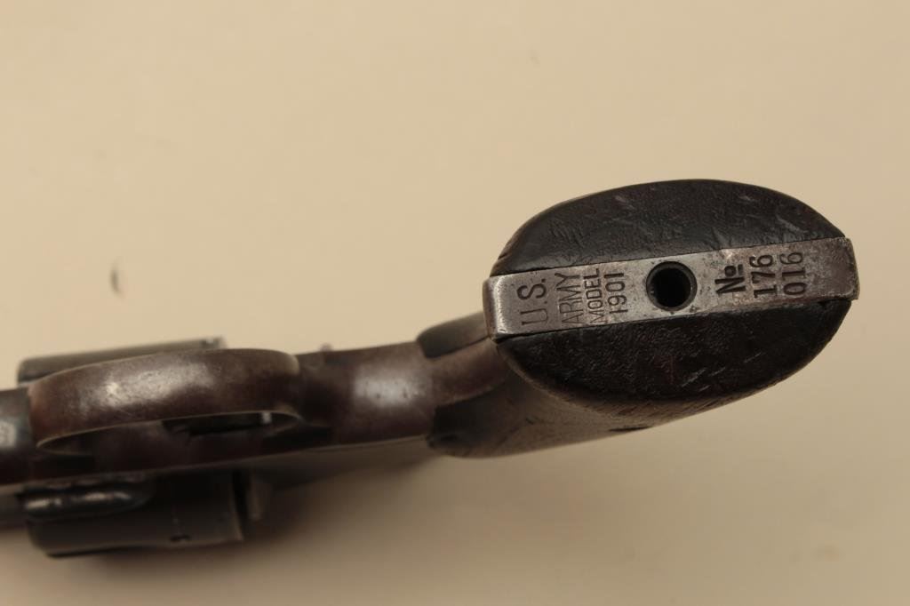 The pistol is in good overall condition with a 6” barrel. The pistol shows considerable flaking original blue finish with the remainder going to patina. There are several military proofs on the frame. The smooth wood grips are in good condition showing mars and compressions consistent with carry and use. The lanyard ring has been removed from the base of the grip. The bore is good, the action is crisp and markings are sharp on this desirable Colt pistol. Est.: $400-$800. (C+R).