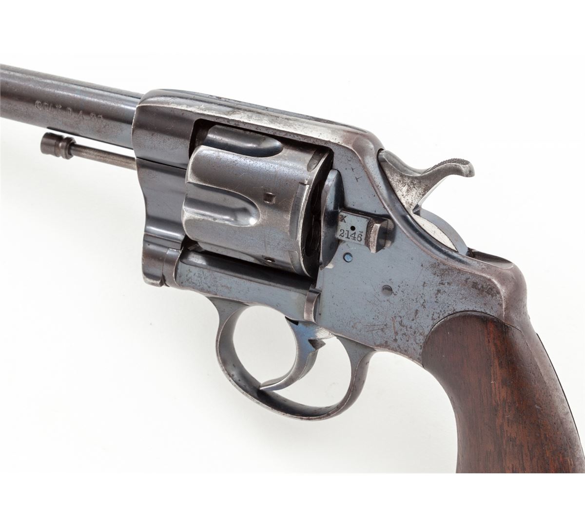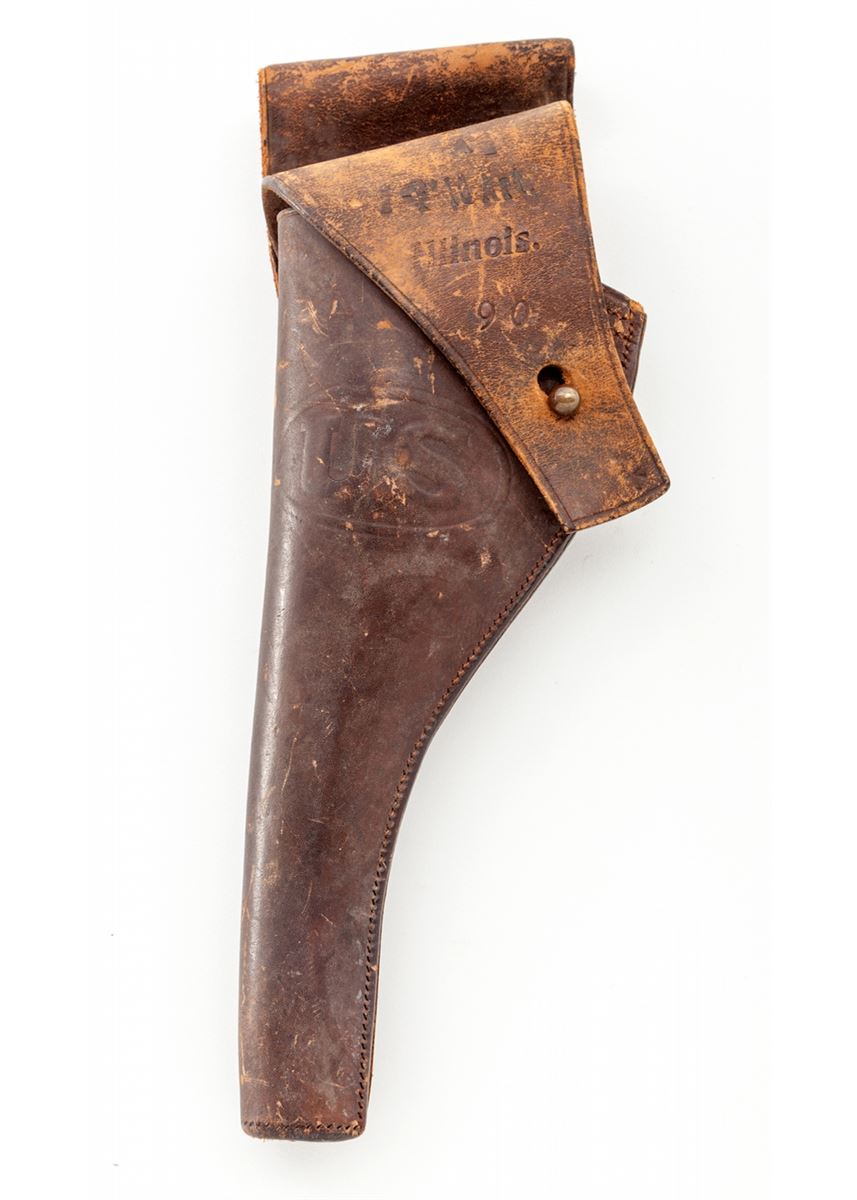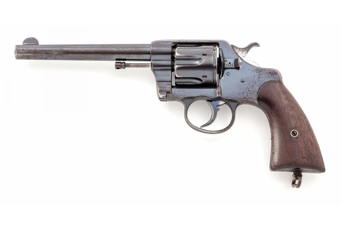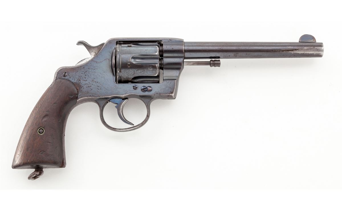 Colt U.S. Army Model 1903 Double Action Revolver, with holster, #202146, .38 Long Colt cal., 6'' barrel, high-polish blue finish, walnut grips. RIA holster dated 1904. Inside of frame at crane numbered 2146. Pistol and grips with RAC inspector's marks. Condition is very good retaining approx. 85%-90% blue, with toning to metal surfaces above grips, and thinning to front and backstrap, as well as butt. Hammer with moderate carbon spotting. Good action, bright bore. Exterior flap of holster marked ''1-F, LD ART./Illinois/90''. Probably issued to the 1st Illinois Field Artillery Regiment prior to or during WWI. Holster with scuffs, scratches, and missing end plug, but clear regimental markings. Est.: $600-$800. (C&R)