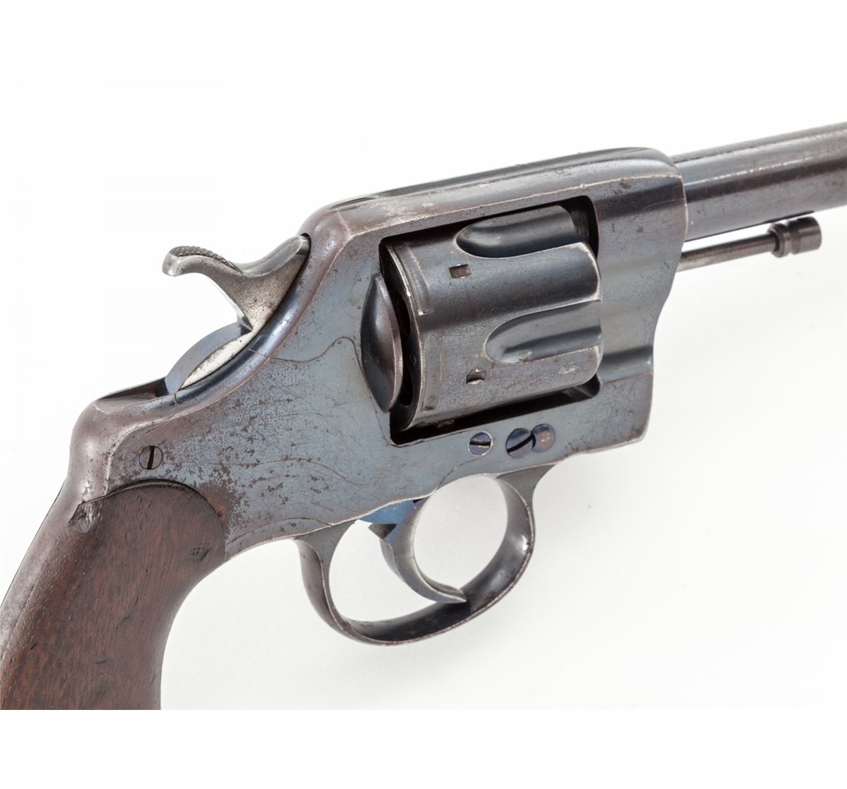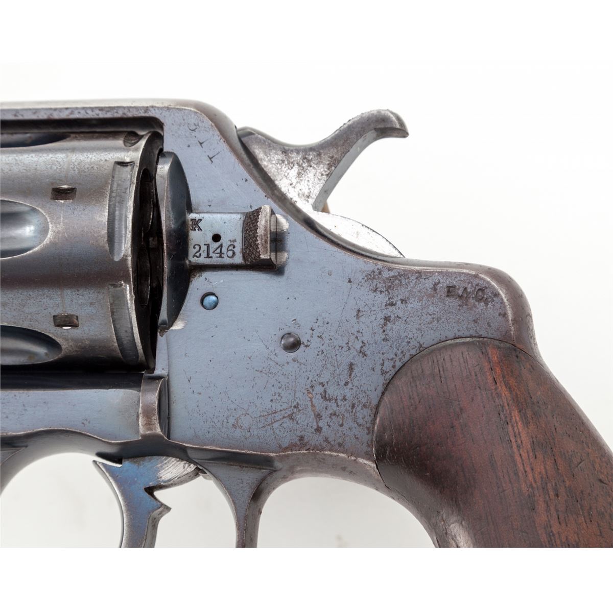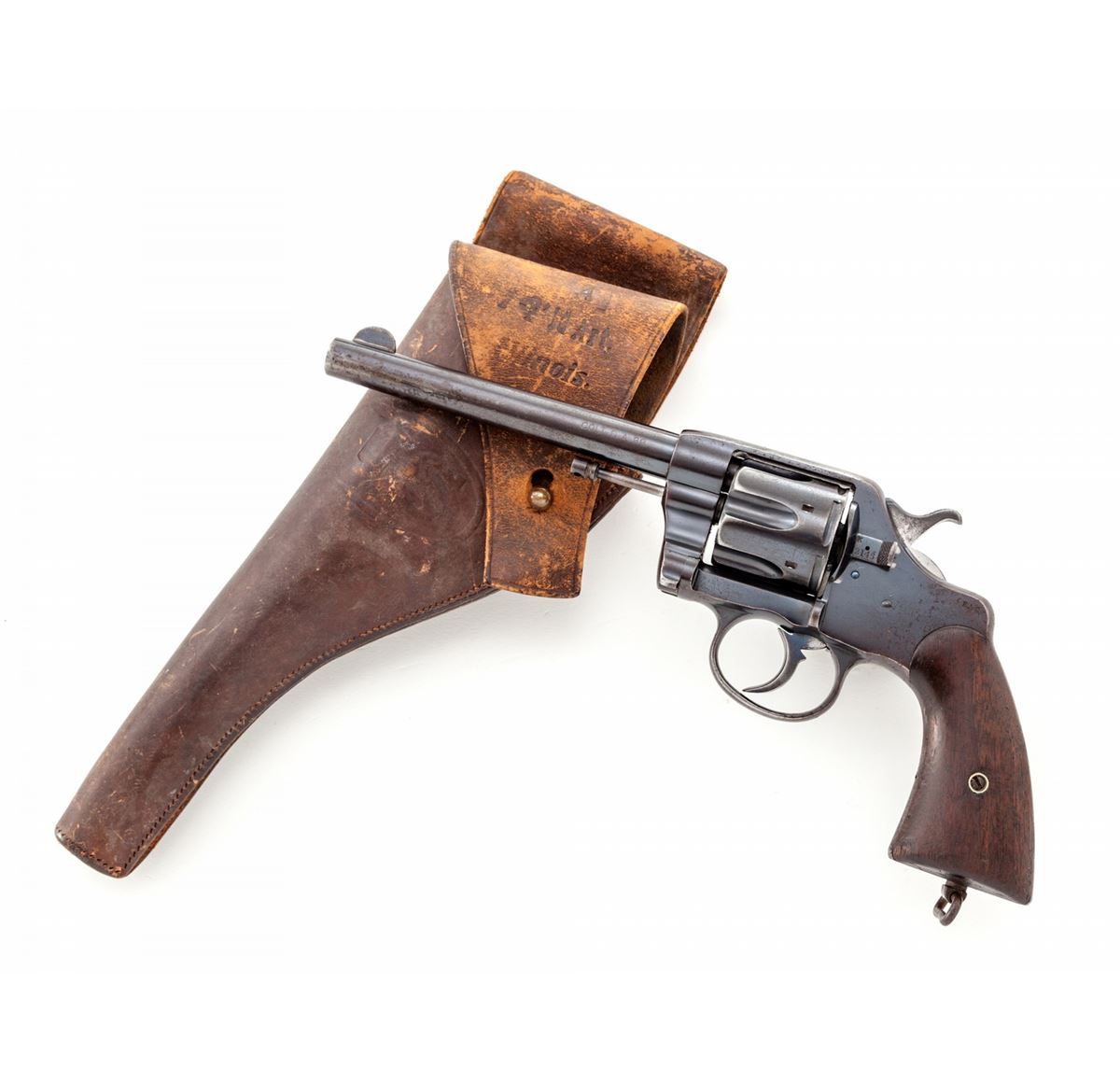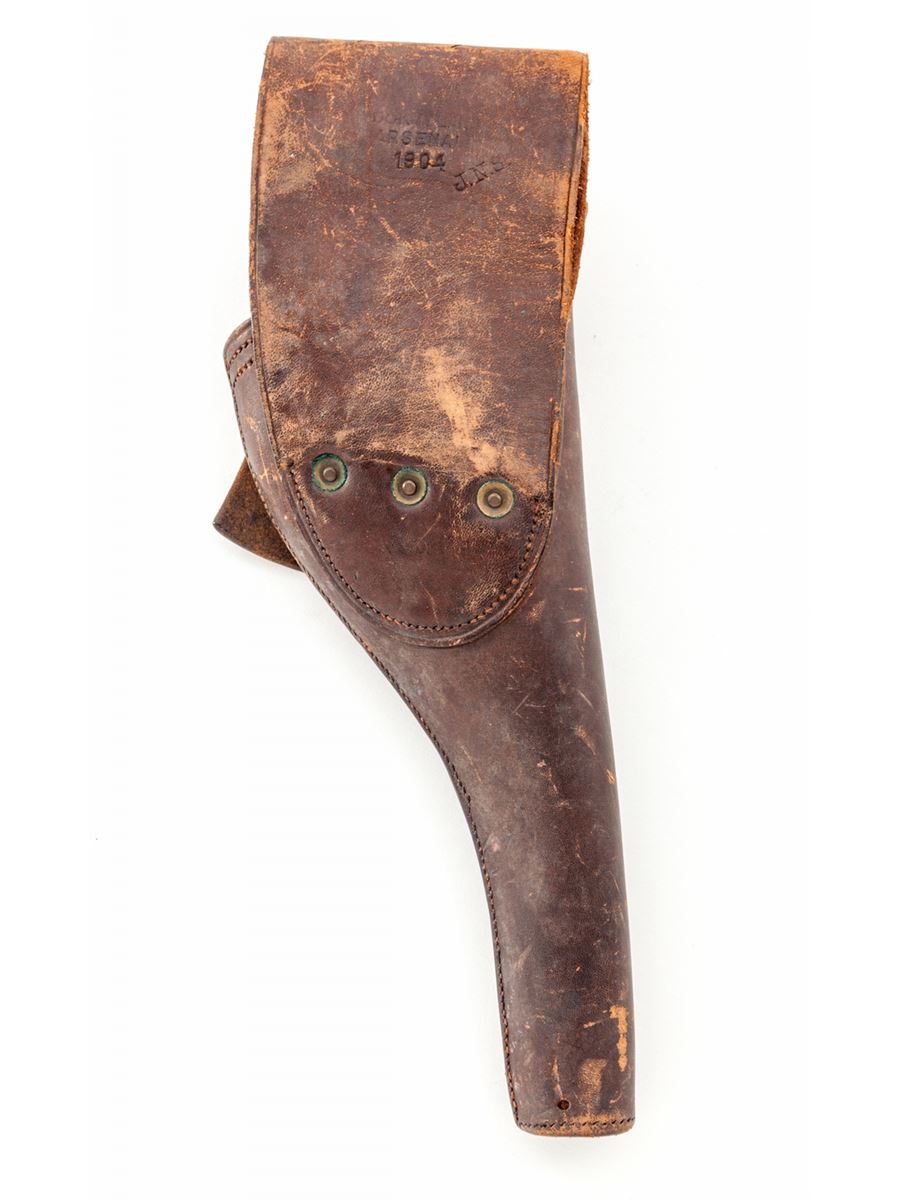 Colt U.S. Army Model 1903 Double Action Revolver, with holster, #202146, .38 Long Colt cal., 6'' barrel, high-polish blue finish, walnut grips. RIA holster dated 1904. Inside of frame at crane numbered 2146. Pistol and grips with RAC inspector's marks. Condition is very good retaining approx. 85%-90% blue, with toning to metal surfaces above grips, and thinning to front and backstrap, as well as butt. Hammer with moderate carbon spotting. Good action, bright bore. Exterior flap of holster marked ''1-F, LD ART./Illinois/90''. Probably issued to the 1st Illinois Field Artillery Regiment prior to or during WWI. Holster with scuffs, scratches, and missing end plug, but clear regimental markings. Est.: $600-$800. (C&R)