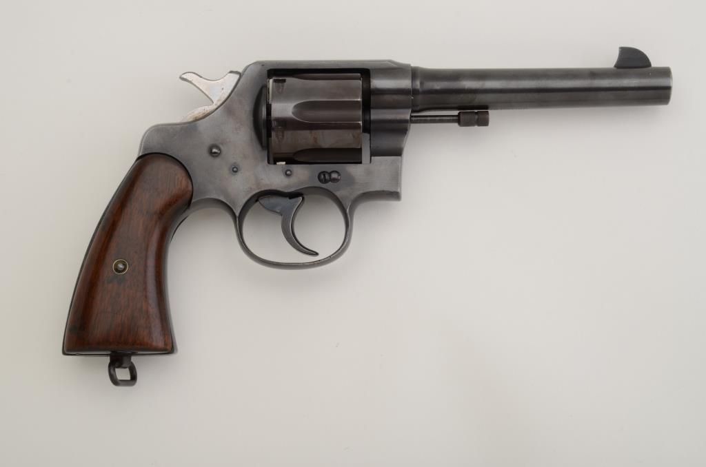 Colt U.S. Army Model 1917 DA revolver, .45 cal., 5-1/2” barrel, re-blued finish, wood grips, lanya