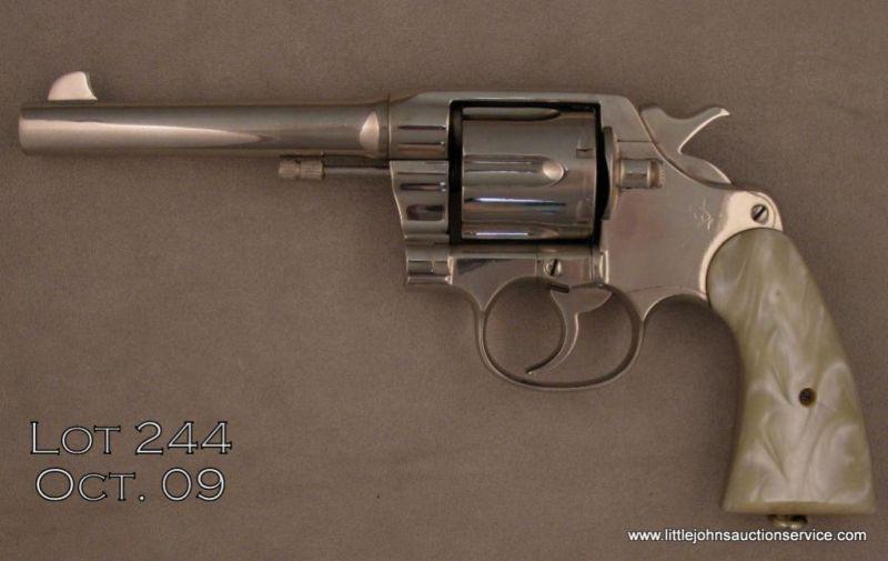 Colt U.S. Army Model 1917 New Service DA revolver, .45 Auto cal., 5-1/2” barrel, nickel finish, faux pearl grips, #269643. This gun is in overall very good condition as re-finished showing approx. 99% of that nickel, the bore is good, the actioncrisp, the markings are light from polishing, the grips are good. Accompanied by a Colt factory letter indicating original shipment to the US Government, Springfield Armory on November 27, 1917 in a shipment of 11,000 same type guns.Est.: $300-$600.