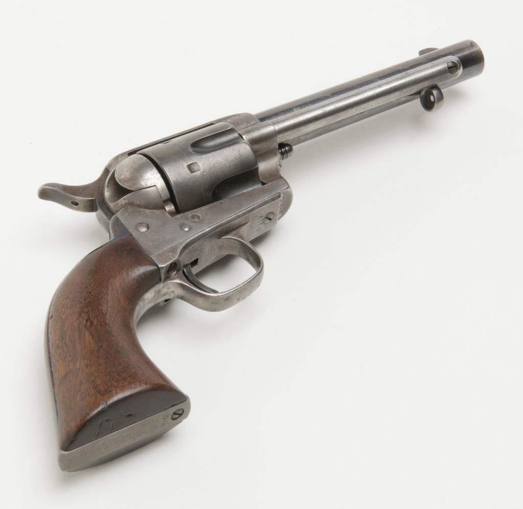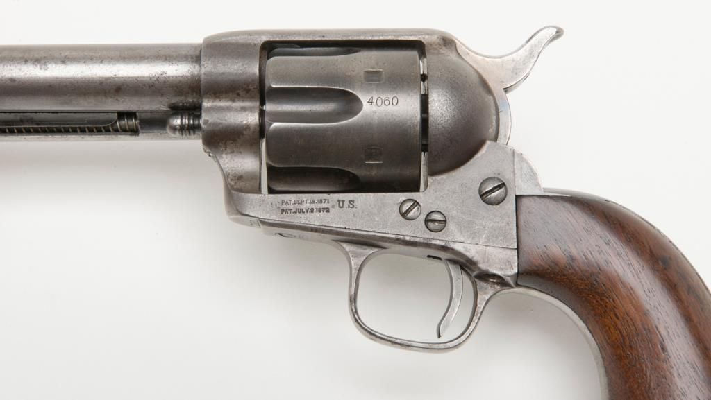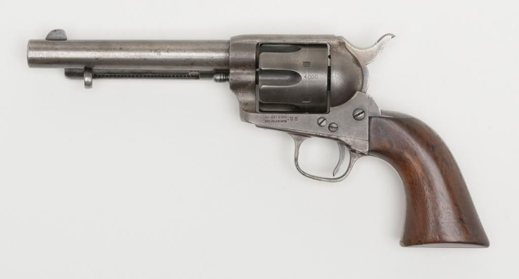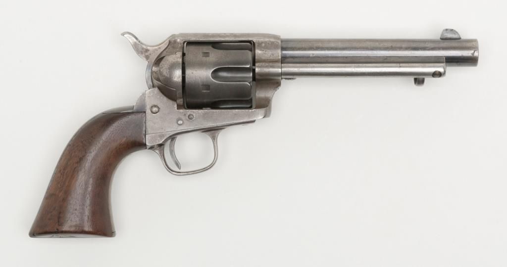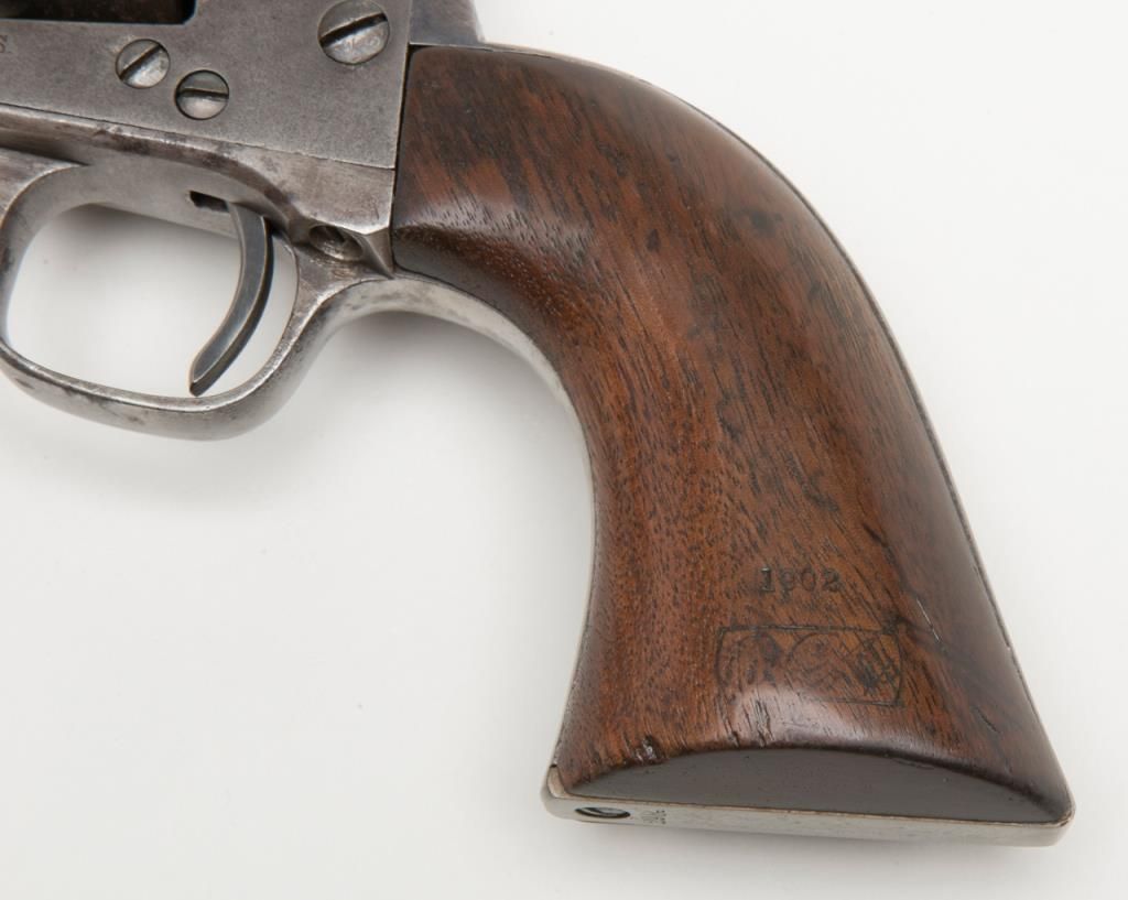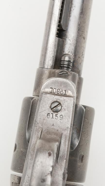 Colt U.S. Artillery Model SAA revolver, .45 cal., 5-1/2” barrel, blue and case color finish, wood grips, #10861; trigger guard is #6159 (“A” inspected); backstrap is #2984 (“A” inspected); cylinder is #4060 (“A” inspected); barrel is #4394 (no visible inspector’s mark, “P” proofed). This gun is in overall very good condition showing approx. 15% original blue on the barrel, approx. 40% original blue on the ejector rod housing, muted blue in the flutes of the cylinder, tracesof blue on the top of the backstrap, scattered silvery toning in protected areas of frame, very good bore, crisp action, very good markings; very good grips with left grip cartouche “OCH” and 1902; right grip cartouche “RAC”. From the estate of Joe Kiser. (Antique). Est.: $3,500-$7,000.