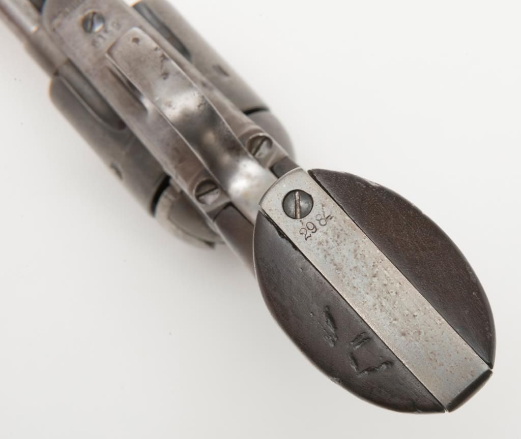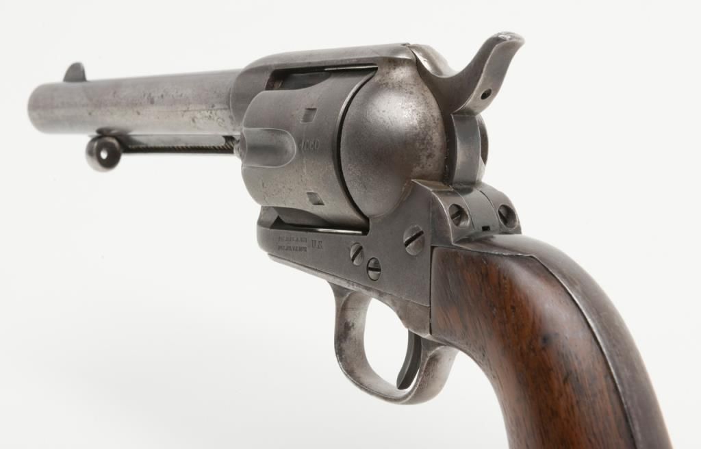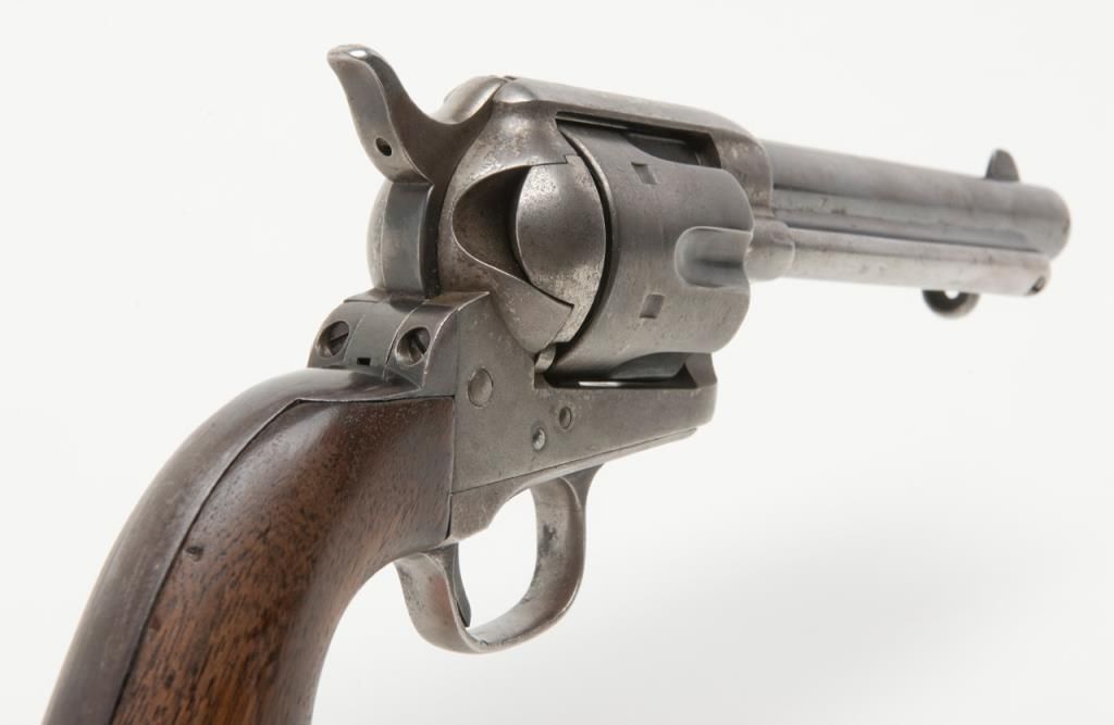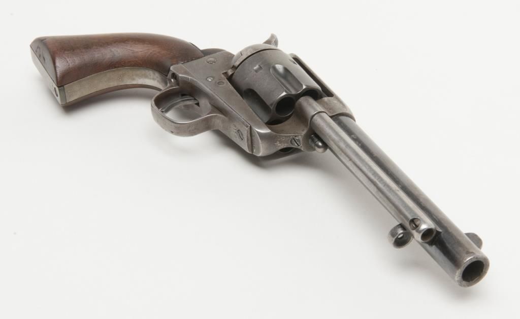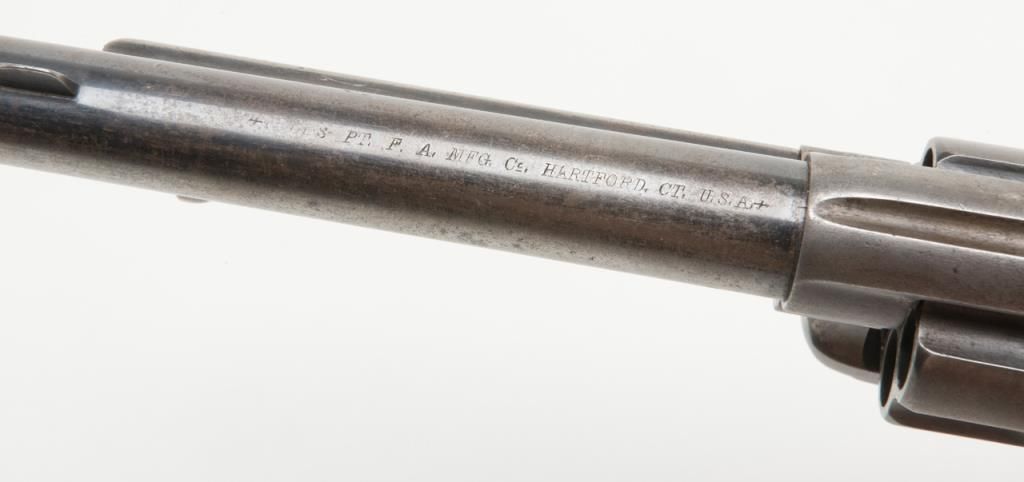 Colt U.S. Artillery Model SAA revolver, .45 cal., 5-1/2” barrel, blue and case color finish, wood grips, #10861; trigger guard is #6159 (“A” inspected); backstrap is #2984 (“A” inspected); cylinder is #4060 (“A” inspected); barrel is #4394 (no visible inspector’s mark, “P” proofed). This gun is in overall very good condition showing approx. 15% original blue on the barrel, approx. 40% original blue on the ejector rod housing, muted blue in the flutes of the cylinder, tracesof blue on the top of the backstrap, scattered silvery toning in protected areas of frame, very good bore, crisp action, very good markings; very good grips with left grip cartouche “OCH” and 1902; right grip cartouche “RAC”. From the estate of Joe Kiser. (Antique). Est.: $3,500-$7,000.