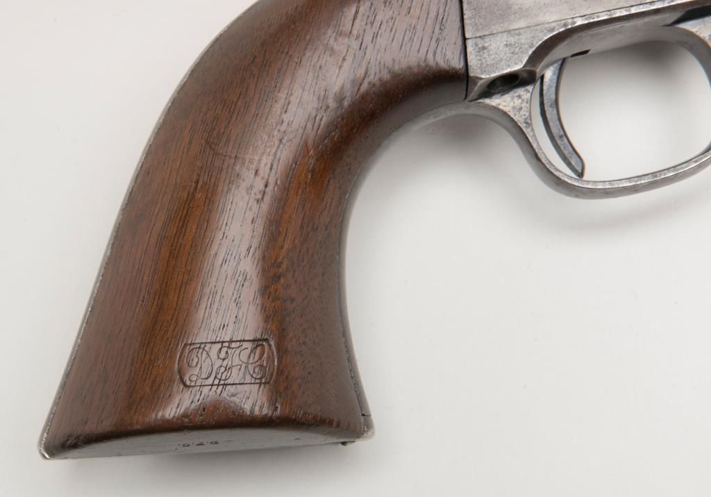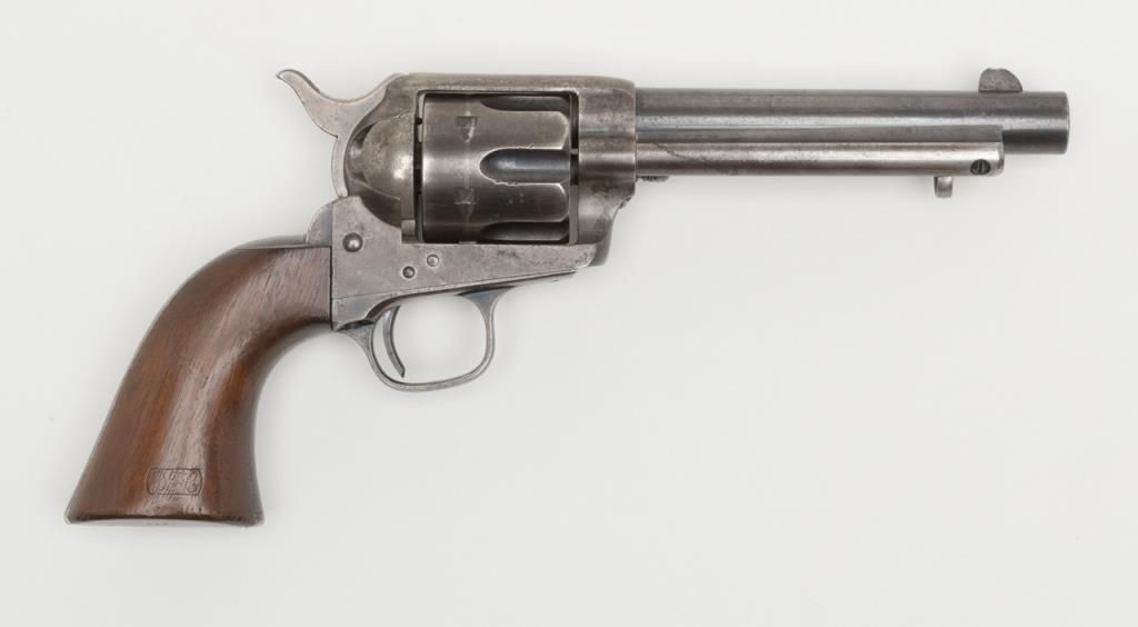 Colt U.S. Artillery Model SAA revolver, .45 cal., 5-1/2” barrel, blue and case hardened finish, wood grips, #31589 (L.D. inspected); trigger guard is #55864; backstrap is #98680; cylinder is #7083 with “J” inspection; barrel is #2685 and “R.A.C.” inspected. This gun is in overall very good condition showing considerable muted blue on the barrel, ejector rod housing, cylinder and straps with that blue more pronounced in protected areas; frame shows contrasting silvery toning and traces of case color in protected areas with hammer also showing case colors; the markings are good with the “U” of the U.S. being not fully struck and missing only the bottom curve; the action is crisp, the bore, very good +, the grips are alsovery good + with sharp cartouches on both sides: left being “FH” with the date 1884 and right being “DFC”; also, the bottom of the right grip is stamped with the “D.F.C.” inspection. From the estate of Joe Kiser. (Antique). Est.:$3,000-$6,000.