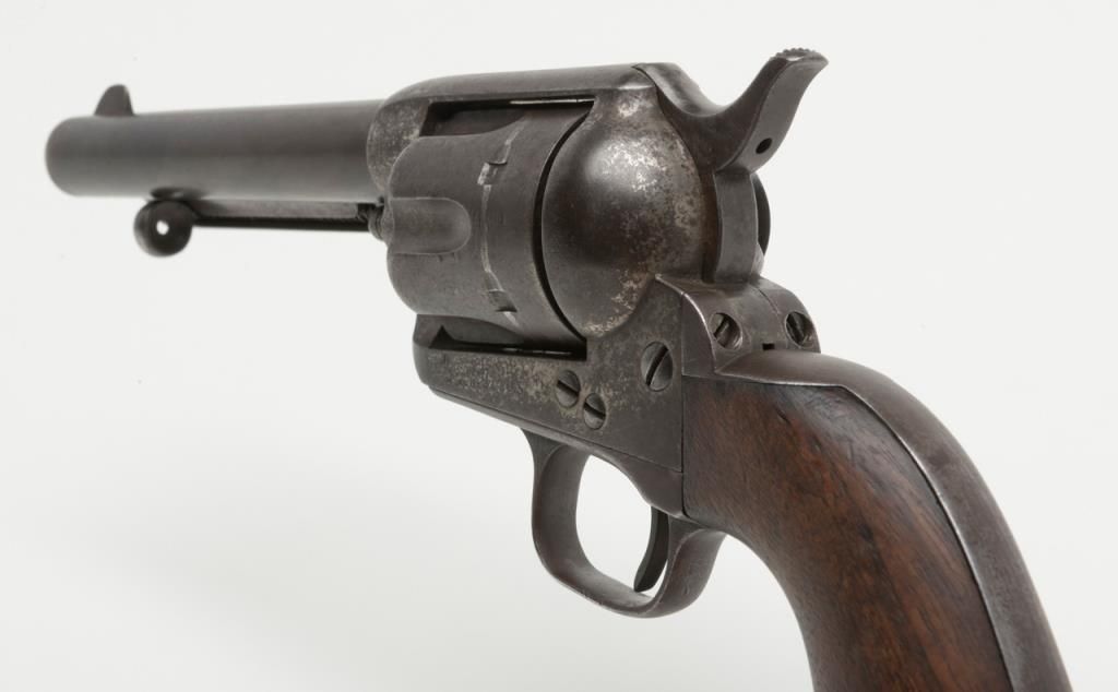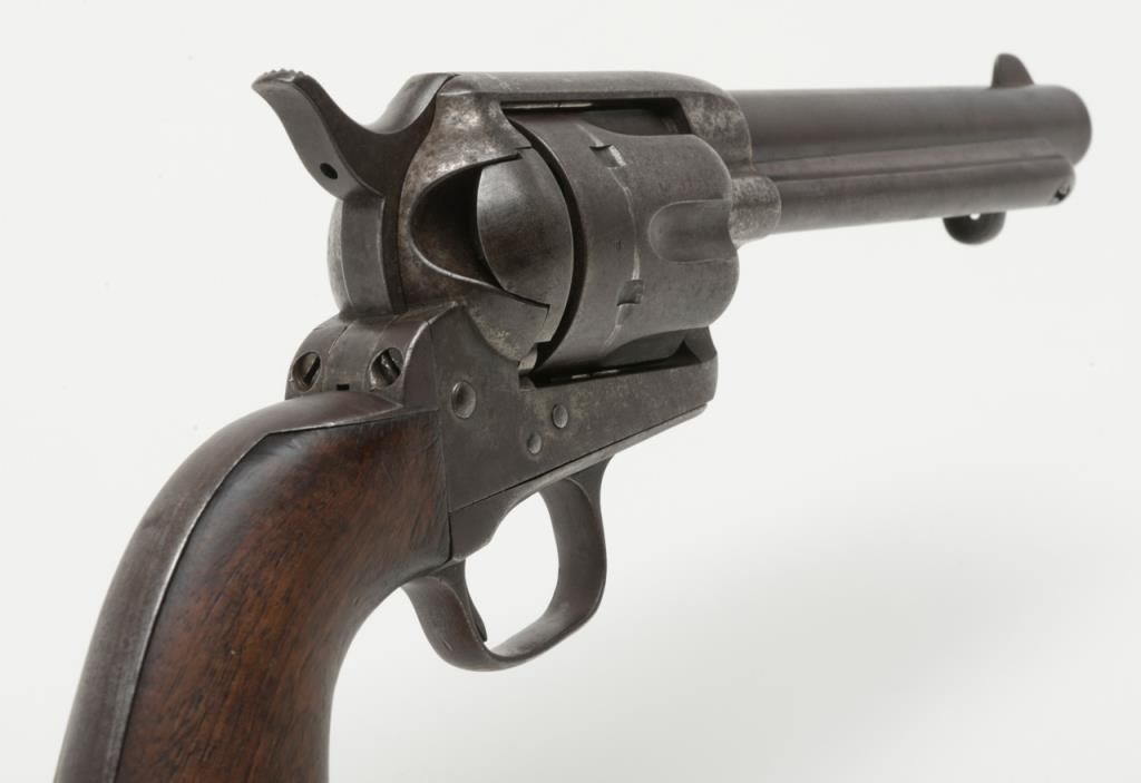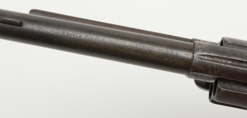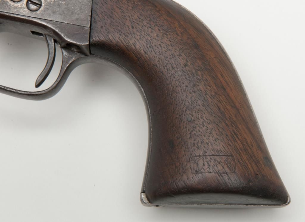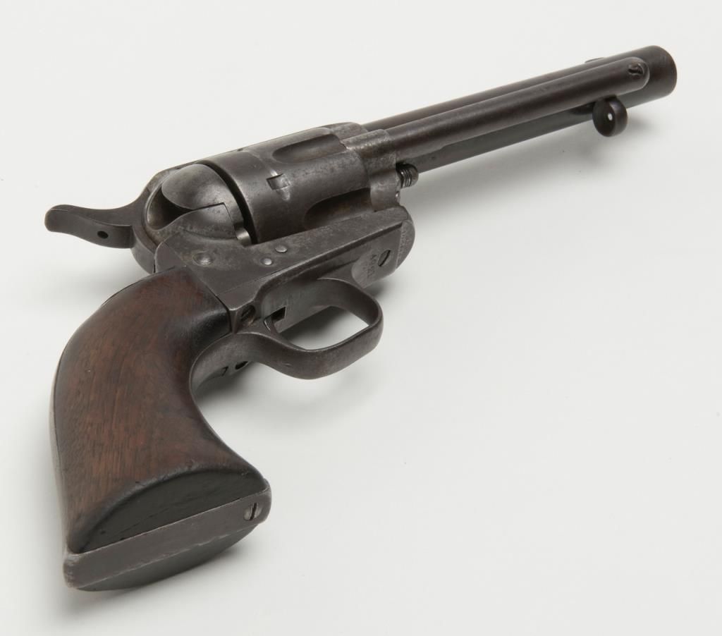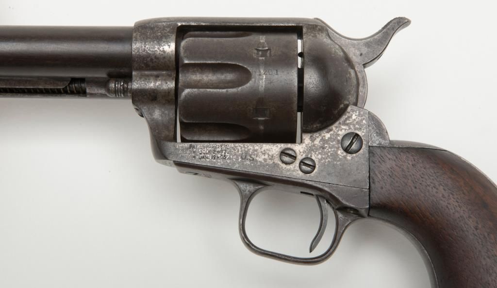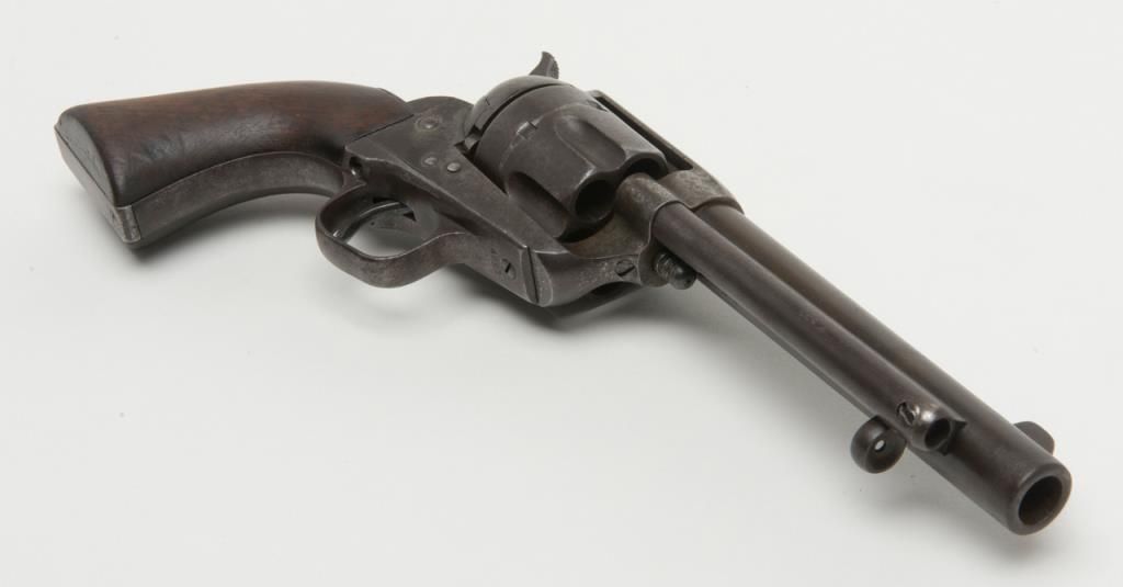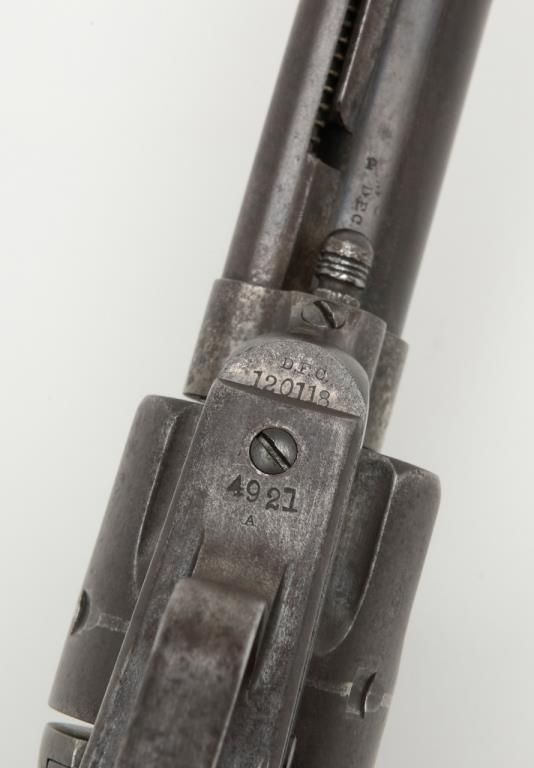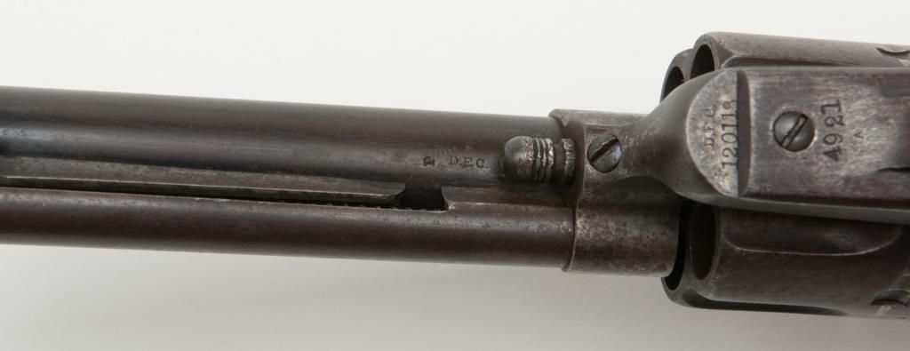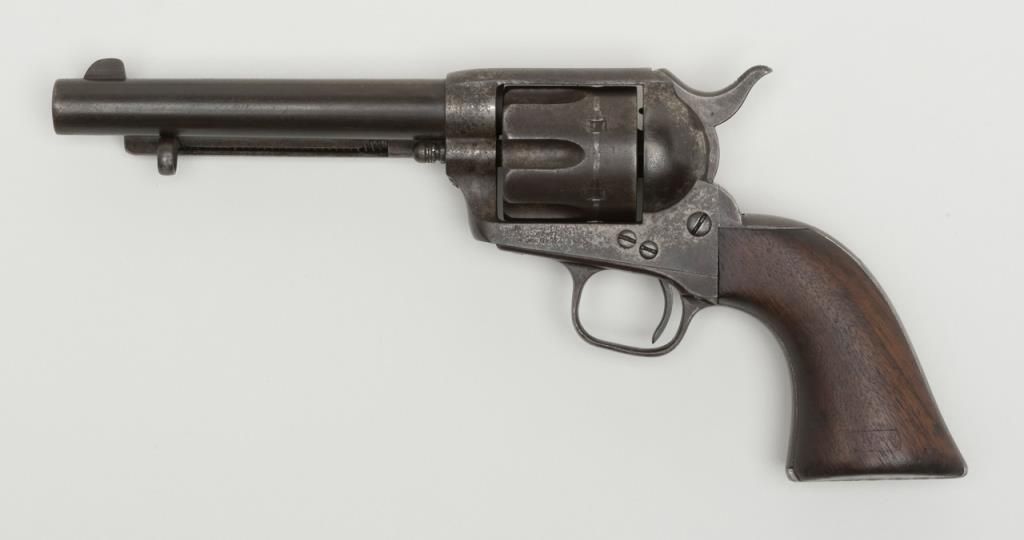 Colt U.S. Artillery Model SAA revolver, .45 cal., 5-1/2” barrel, blue and case hardened finish, wood grips, #120118 (“D.F.C.” inspected); trigger guard #4921 (“A” inspected); backstrap #35383; cylinder #1201 (“D.F.C.” inspected): barrel #0451 (“D.F.C.” inspected); wood grips with “OWA” cartouche on left side of grips. This Artillery Model is in overall good condition showing a dark patina on barrel, cylinder and straps with a combination of silvery toning and dark patina tothe frame; crisp action, good markings, very good bore and grips. From the estate of Joe Kiser. (Antique). Est.: $2,500-$5,000.