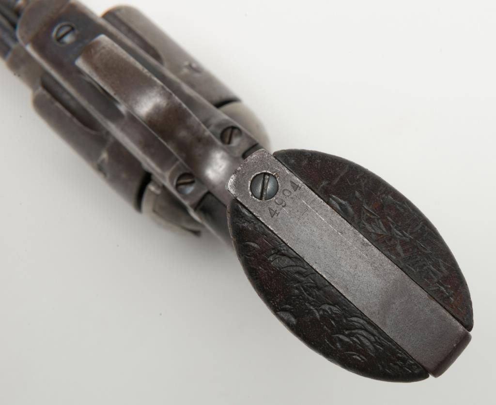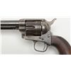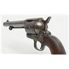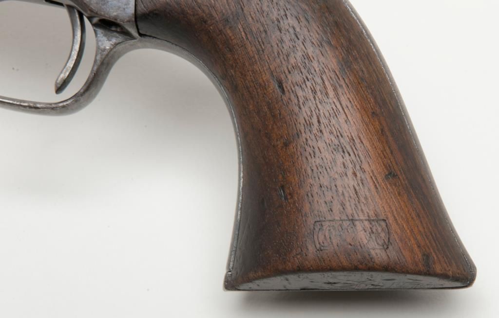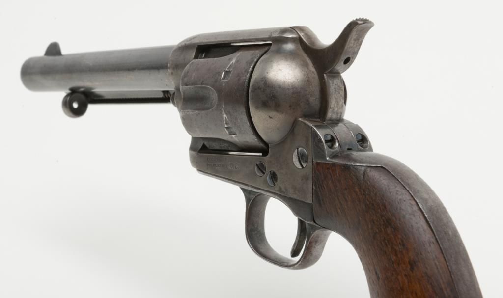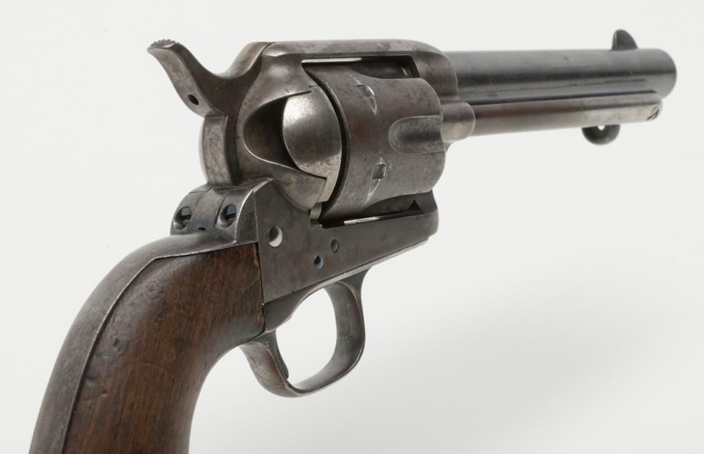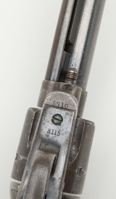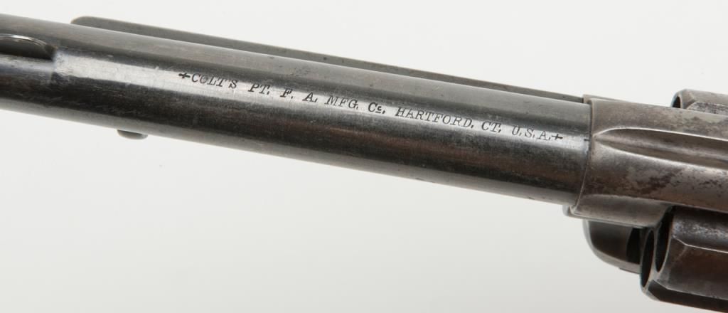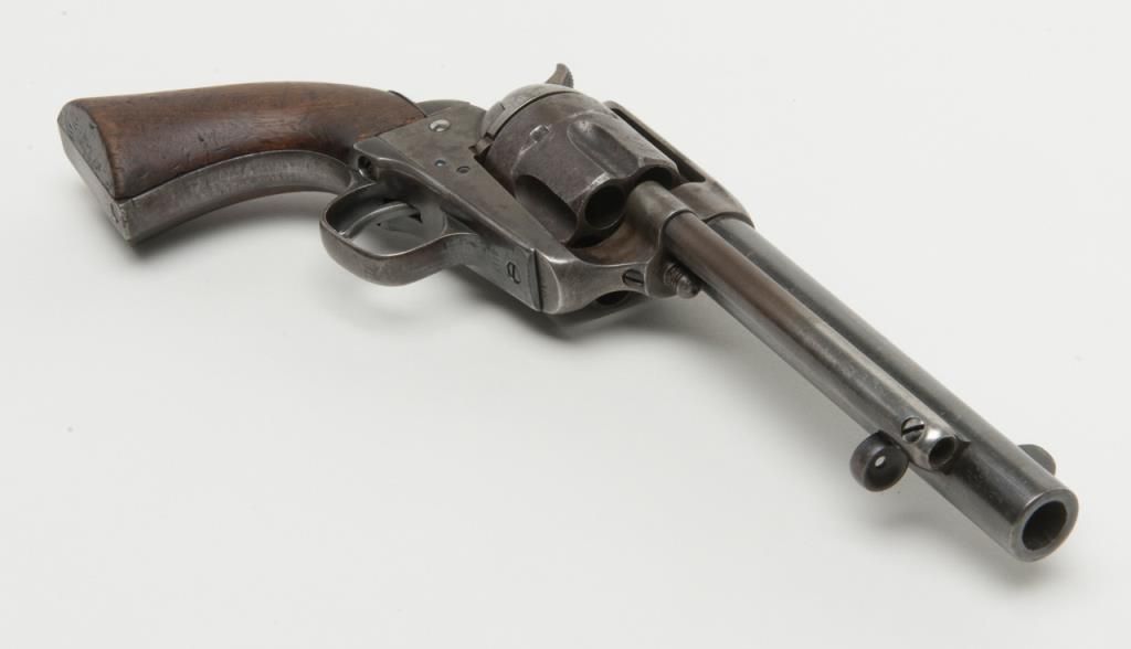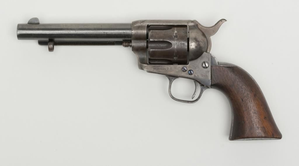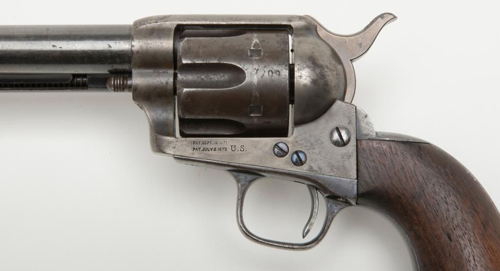 Colt U.S. Artillery Model SAA revolver, Custer range frame #5710; trigger guard #3115 (“A” inspected, backstrap #4994 (“A” inspected), cylinder #7_09 (“A” inspected); barrel #0004 (“A” inspected), “OWA” cartouche on left grip. Thisgun is in overall very good condition showing scattered areas of blue on barrel and ejector housing, traces of blue in flutes of cylinder with balance gone to a plum brown patina with some spots of erosion and pinprick pitting, areas ofblue on trigger guard and backstrap with frame displaying case colors in protected areas with balance gone to silvery toning and some scattered spots of erosion; crisp action, very good markings and very good to near fine bore; grips are goodto very good with knackering to the bottom of grips from hammering plus scattered old mars and dings from carry and storage. From the estate of Joe Kiser. (Antique). Est.: $3,000-$6,000.