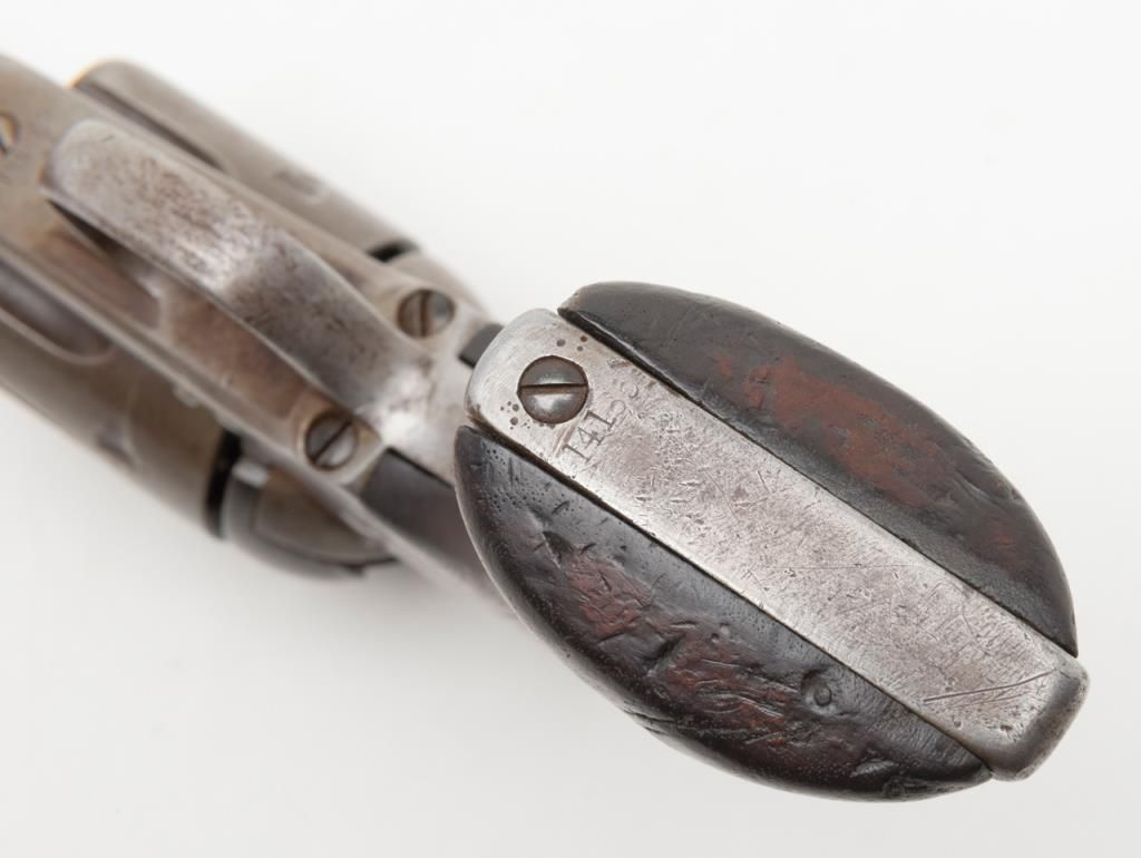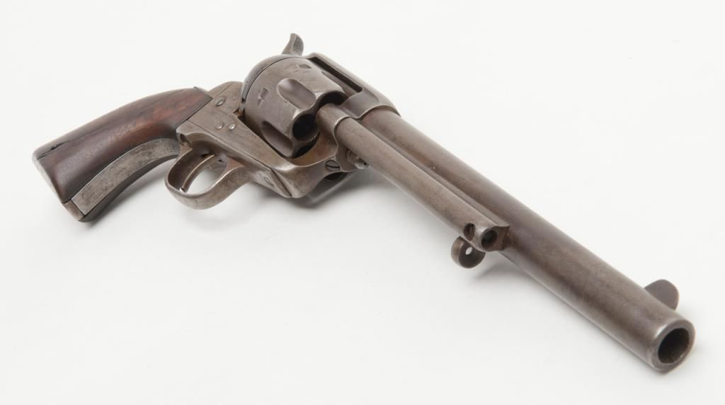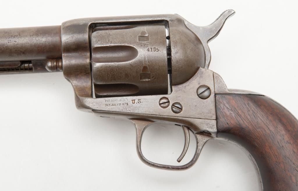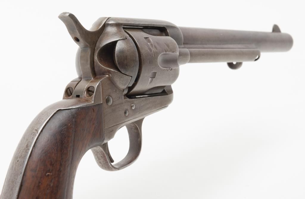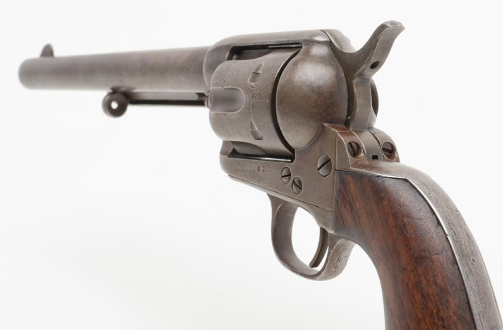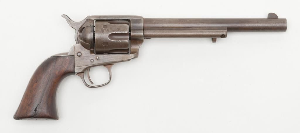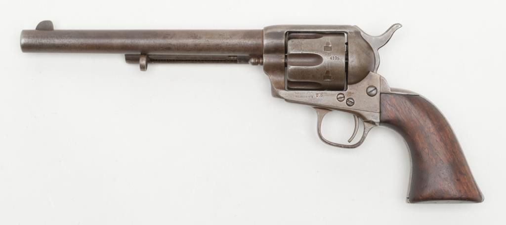 Colt U.S. Calvary Model SAA revolver, .45 cal., 7-1/2” barrel, blue and case hardened finish, wood grips, #14185 in overall very good condition showing a brown patina to metal surfaces, matching serial numbers including the barrel, italicizedbarrel address, good to very good bore, crisp action, very good markings, good grips with no visible cartouche, some scattered old mars and two small old cracks on the lower right side grip; cylinder pin retaining screw is a laterreplacement. These early Martial Cavalry revolvers are hard to find given their period of hard use and the fact that many were altered into Artillery Models in the late 1900’s. (Antique). Est.: $3,500-$7,000.