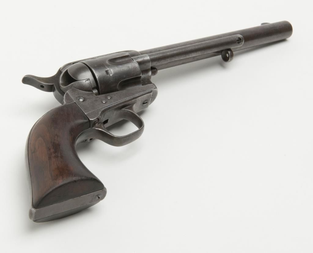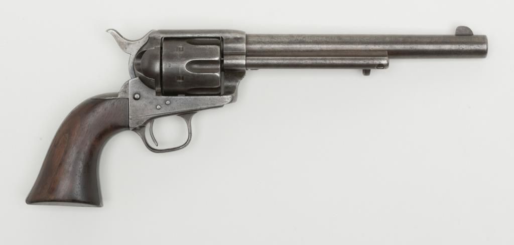 Colt U.S. Cavalry Model SAA revolver, .45 cal., 7-1/2” barrel, blue and case hardened finish, wood grips, #11460, trigger guard #11460 (“A” inspected); backstrap #11460 (“A” inspected); cylinder #1460 (“A” inspected); barrel #1460 (“A”inspected); wood grips with partially visible inspector’s cartouche on left grip. This Colt is in overall very good condition showing a dark grey patina with scattered pinprick pitting, very good bore, crisp action, good markings and very goodgrips; a nice all matching Ainsworth Cavalry. From the estate of Joe Kiser. (Antique). Est.: $5,000-$10,000.