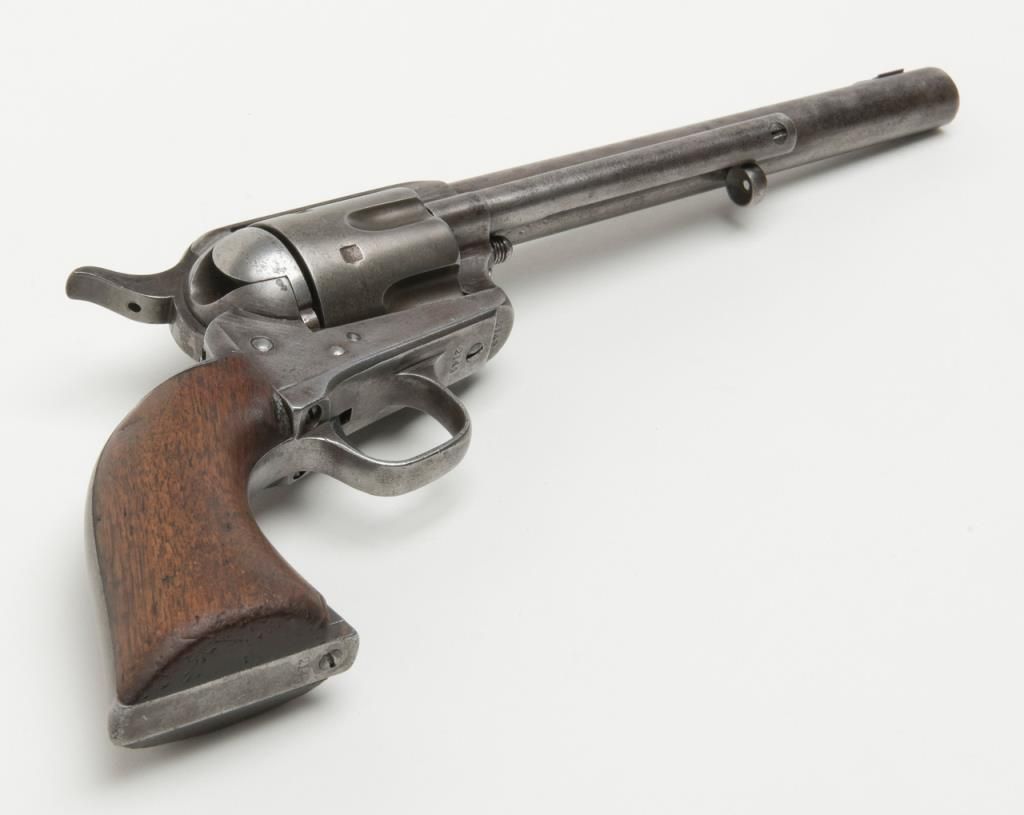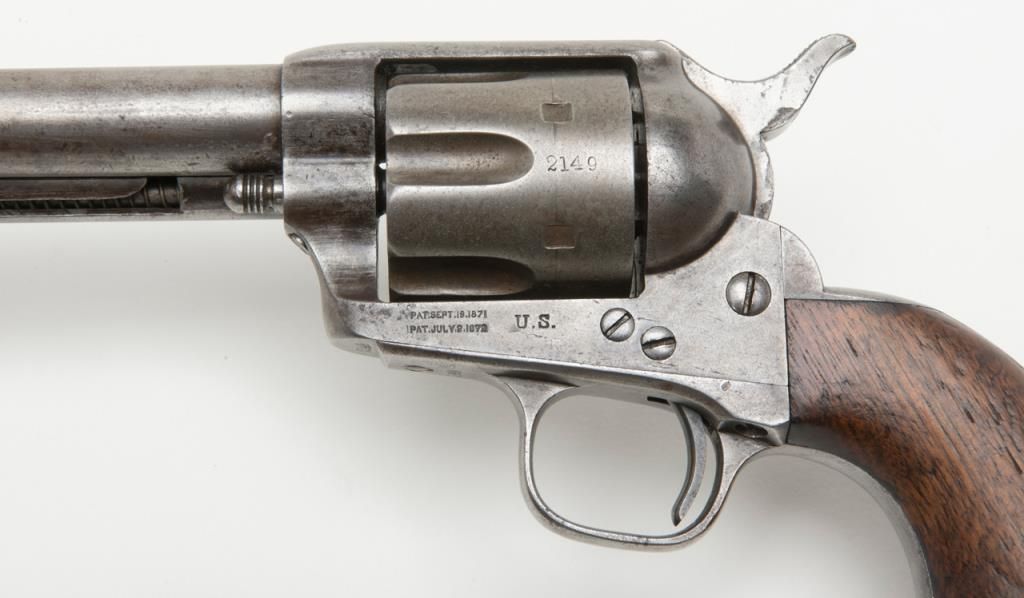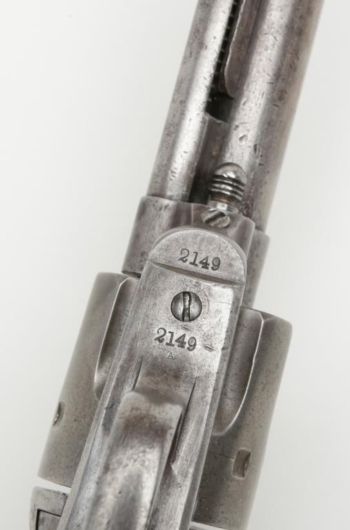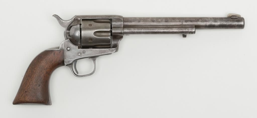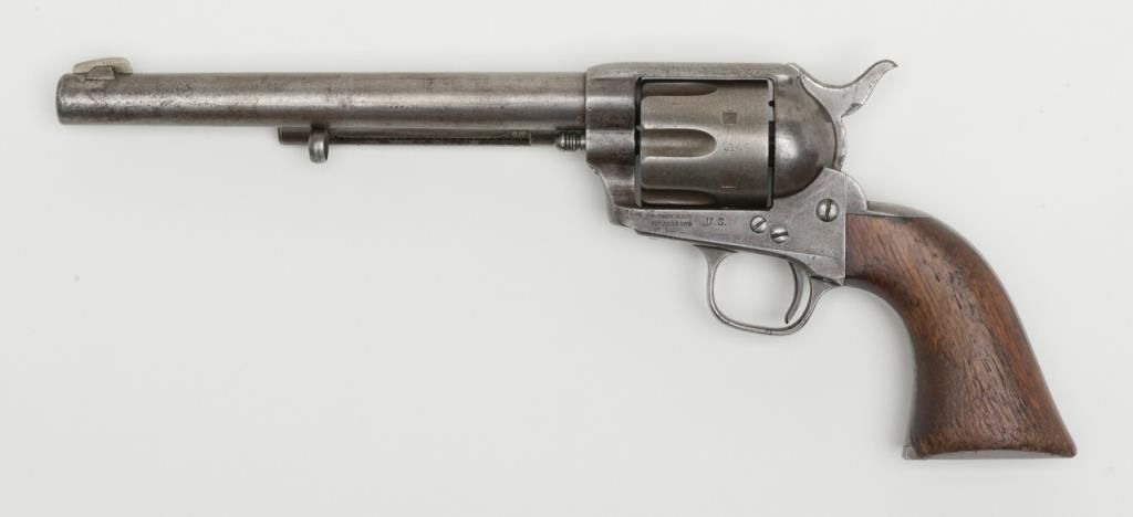 Colt U.S. Cavalry Model SAA revolver, .45 cal., 7-1/2” barrel, blue and case hardened finish, wood grips, #2149; trigger guard #2149 (“A” inspected); trigger guard #2149 (“A” inspected); cylinder #2149 (“A” inspected); barrel #2149 (“A”inspected), wood grips. This gun is in overall very good condition showing a grey patina, good to very good bore, crisp action, very good markings, replaced blade front sight and good to very good grips showing no visible cartouches, someweathering on the bottom of the left grip and an old small loss on the front toe of that grip; matching small loss on the right side grip. A very nice all matching early Ainsworth Cavalry Model. From the estate of Joe Kiser.(Antique). Est.: $5,000-$10,000.