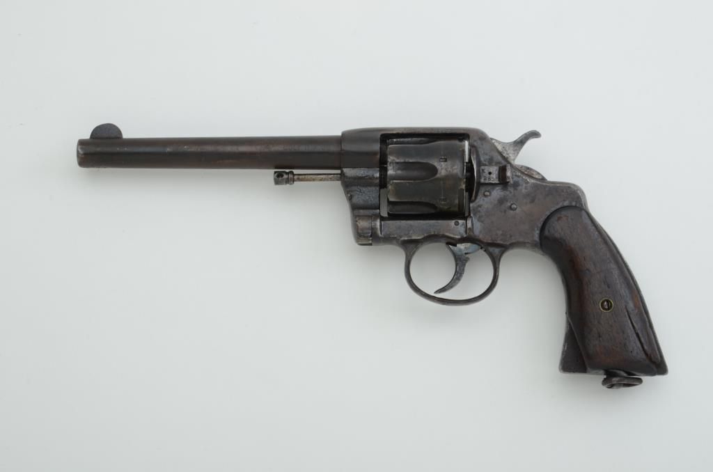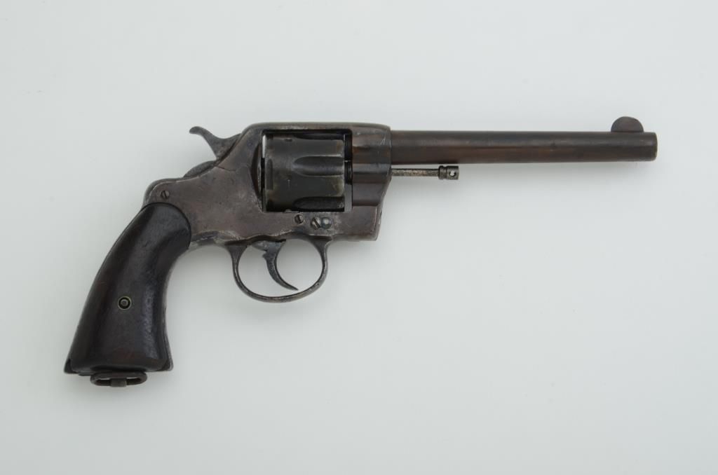 Colt U.S. Model 1894 DA revolver, .38 cal., 6” barrel, blue finish, wood grips, #62855 with lanyard ring. This gun is in well-worn condition showing a brown patina with spots of erosion, pitting and some scattered mars,action not working, worn bore, grips show wear, cracks and losses. Est.: $75-$150.
