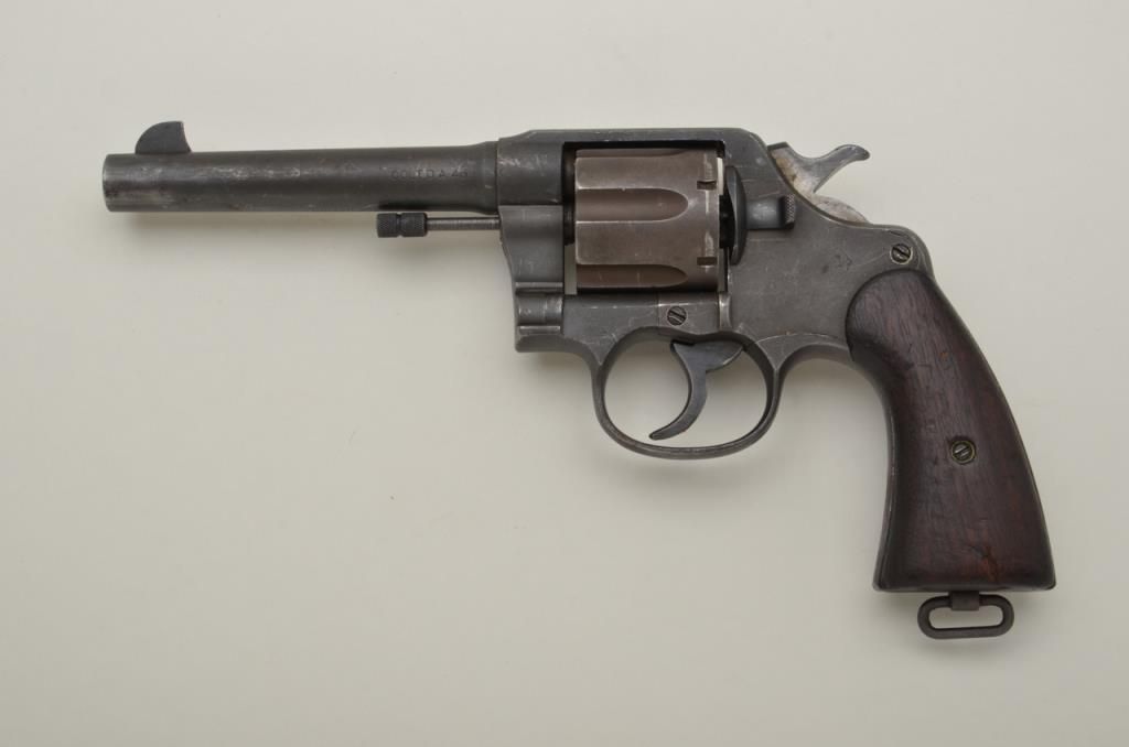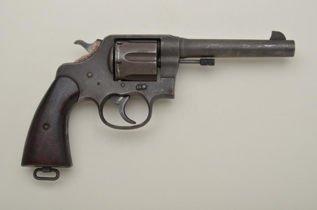 Colt U.S. Model 1917 DA revolver, .45 cal., 5-1/2” barrel, parkerized finish, wood grips, #129541 in